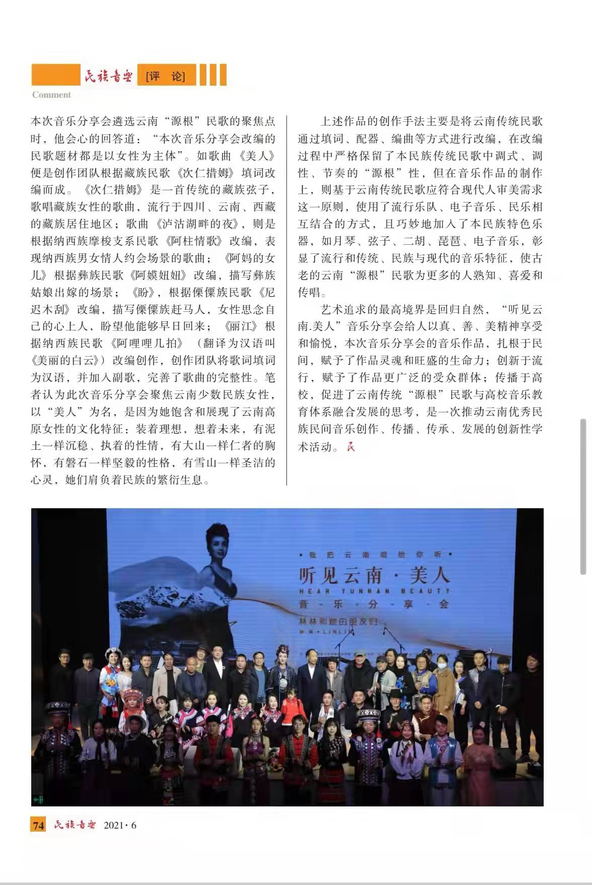 《民歌新唱:新文科教学改革新实践——记歌唱家林林教授与“听见云南·美人”音乐会》 《守住“源根”——“听见云南·美人 ”音乐分享会作品创作密码》刊登于《民族音乐》2021年第6期。