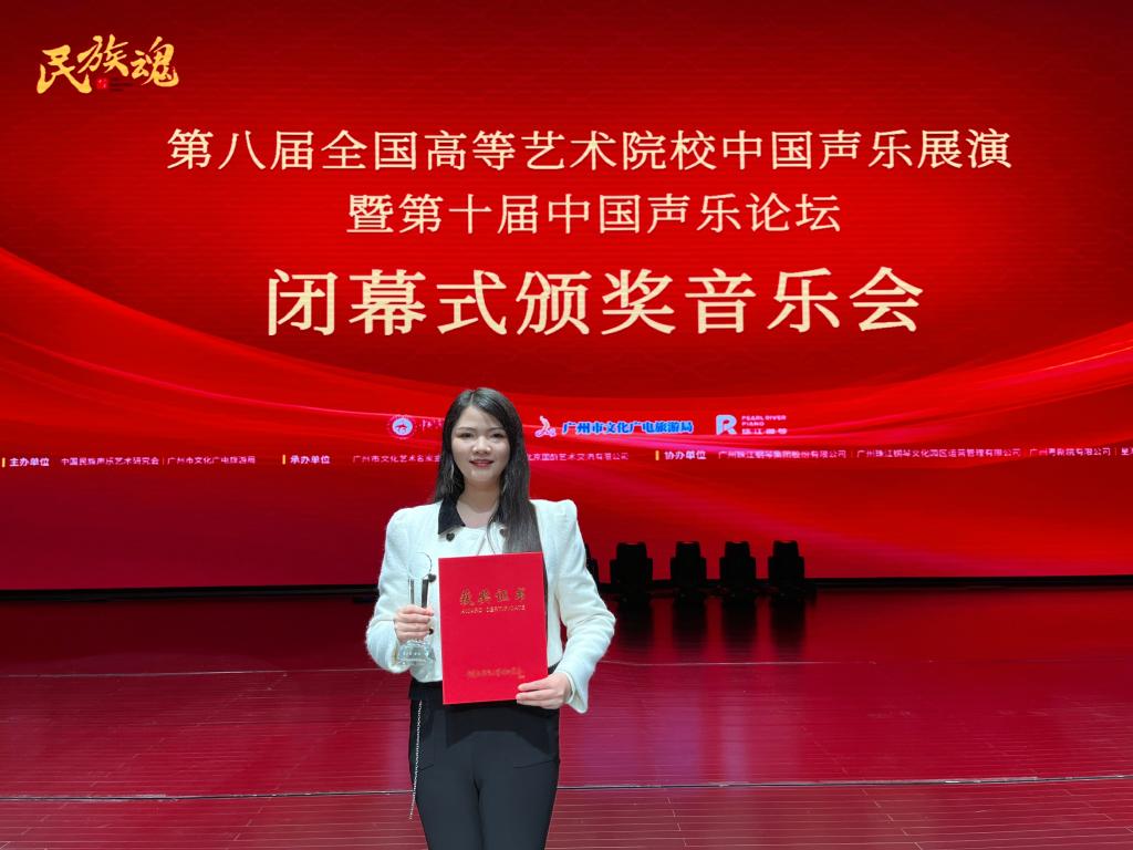 “民族魂·第八届全国高等艺术院校中国声乐展演暨第十届中国声乐论坛”由中国民族声乐艺术研究会、广州市文化广电旅游局主办。本次展演为全国音乐类重量级专业赛事,pg娱乐电子游戏官网入口选送的参赛选手经过层层选拔,在比赛中喜获佳绩。体现了pg娱乐电子游戏官网入口在学校党委的正确领导下,认真贯彻党的教育方针和党的文艺方针政策,以党建为引领,开展“党建+思政+音乐”实践,加强音乐表演专业国家一流本科专业建设,实施本科生拔尖创新人才培养计划、硕士研究生“云端领翔”实施方案,促进人才培养取得新成绩。