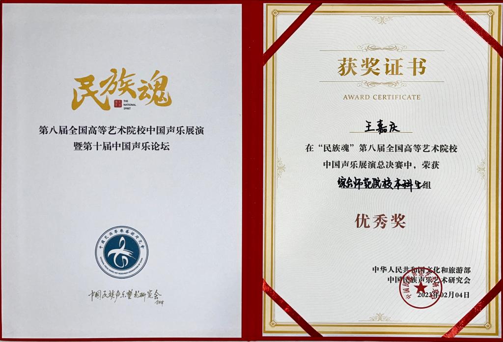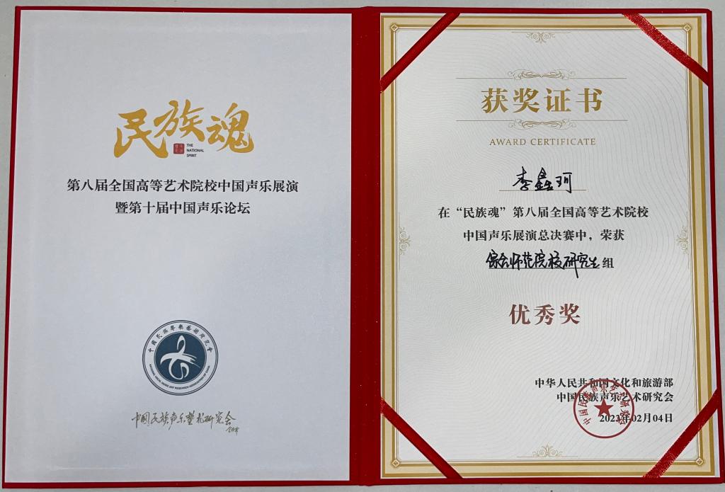 2023年2月,pg娱乐电子游戏官网入口师生在“民族魂·第八届全国高等艺术院校中国声乐展演”中喜获佳绩,研究生姚弦歌荣获综合师范院校研究生组金奖,指导教师林林教授获优秀指导教师奖。此外,pg娱乐电子游戏官网入口在本次展演中斩获佳绩的学生还有王嘉庆荣获综合师范院校本科生组优秀奖,指导教师为陈红玲教授;李鑫珂获综合师范院校研究生组优秀奖,指导教师为舒丽萍副教授。