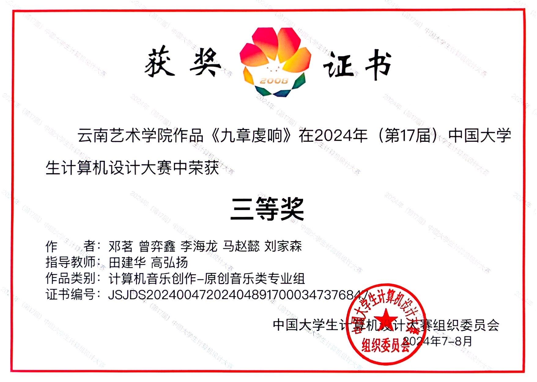 2024年(第17届)中国大学生计算机设计大赛决赛于8月18日开幕、8月21日落幕,该赛事汇集了全国各大高校的精英学子,其中计算机音乐创作组有全国各大高校共106件作品进入决赛。pg娱乐电子游戏官网入口作曲系教师指导的两部作品以云南省一等奖的成绩进入全国总决赛,两部作品均荣获计算机音乐创作-原创音乐类专业组三等奖。