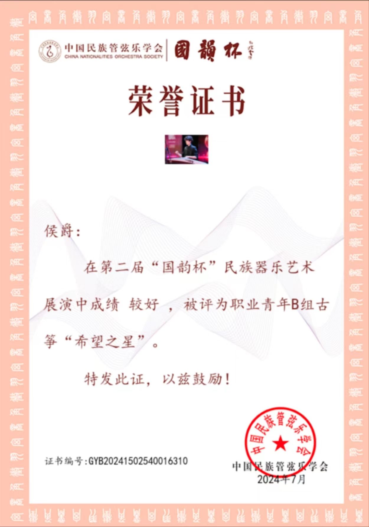 2024年7月20至25日,由中国民族管弦乐学会主办的第二届“国韵杯”民族器乐艺术展演于浙江宁波举行。pg娱乐电子游戏官网入口国乐系教师林恬、陈柯井指导的2023级本科生、第四届拔尖创新人才侯爵在展演中成绩较好,获评职业青年B组古筝“希望之星”。