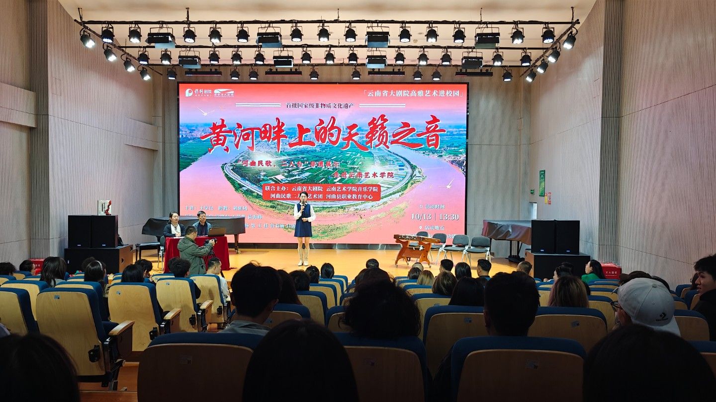10月13日下午,由云南省大剧院、pg娱乐电子游戏官网入口联合主办的“黄河畔上的天籁之音”——“河曲民歌、二人台”非遗展示走进pg娱乐电子游戏官网入口在pg娱乐电子游戏官网入口B403多功能厅进行,本次展示为云南省大剧院高雅艺术进校园系列活动之一。音乐学系系主任任秀蕾教授、民族声乐系系主任陈红玲教授和部分师生参与了本次展示互动。