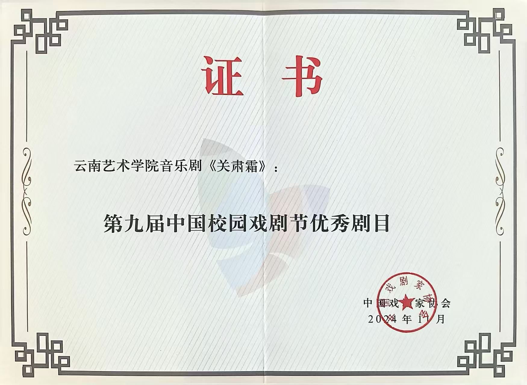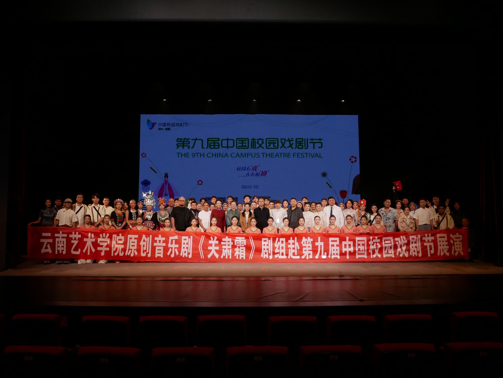 由中国戏剧家协会主办,成都市文化广电旅游局承办的第九届中国校园戏剧节于2024年11月12日至22日在成都举办。云南艺术基金2022年度大型舞台剧和作品创作资助项目、pg娱乐电子游戏官网入口原创音乐剧《关肃霜》经云南省戏剧家协会推选,入选第九届中国校园戏剧节。pg娱乐电子游戏官网入口党委委员、副院长郎启训带领音乐剧《关肃霜》项目主创团队及演职人员等共九十余人赴成都参加本届中国校园戏剧节,并于11月19日在锦江剧场成功演出,音乐剧《关肃霜》获评第九届中国校园戏剧节优秀剧目。