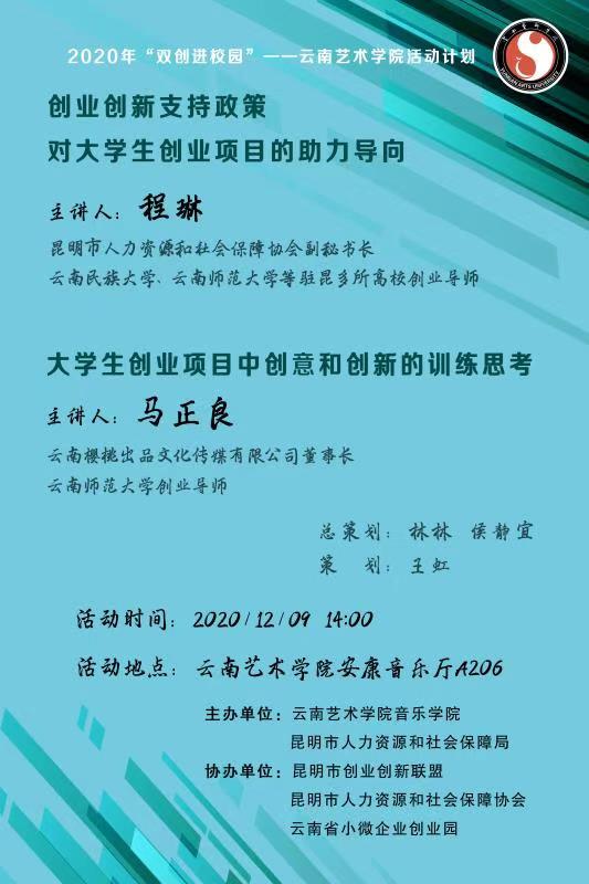 2020年12月9日14:00,pg娱乐电子游戏官网入口在安康音乐厅举办了创新创业专题讲座,讲座由《创业创新支持政策对大学生创业项目的助力向导》《大学生创业项目中创意和创新的训练思考》两个专题辅导和pg娱乐电子游戏官网入口获奖创业项目“云南创新型民族打击乐器——南乌孔雀鼓”展示三个部分组成,pg娱乐电子游戏官网入口副院长侯静宜、昆明市人力资源和社会保障协会副秘书长程琳、云南樱桃出品文化传媒有限公司董事长、云南师范大学创业导师马正良、昆明市人力资源和社会保障协会大学生创新创业中心钟健文及pg娱乐电子游戏官网入口300多名学生参加了此次讲座,讲座由pg娱乐电子游戏官网入口教学管理科副科长王虹主持。
