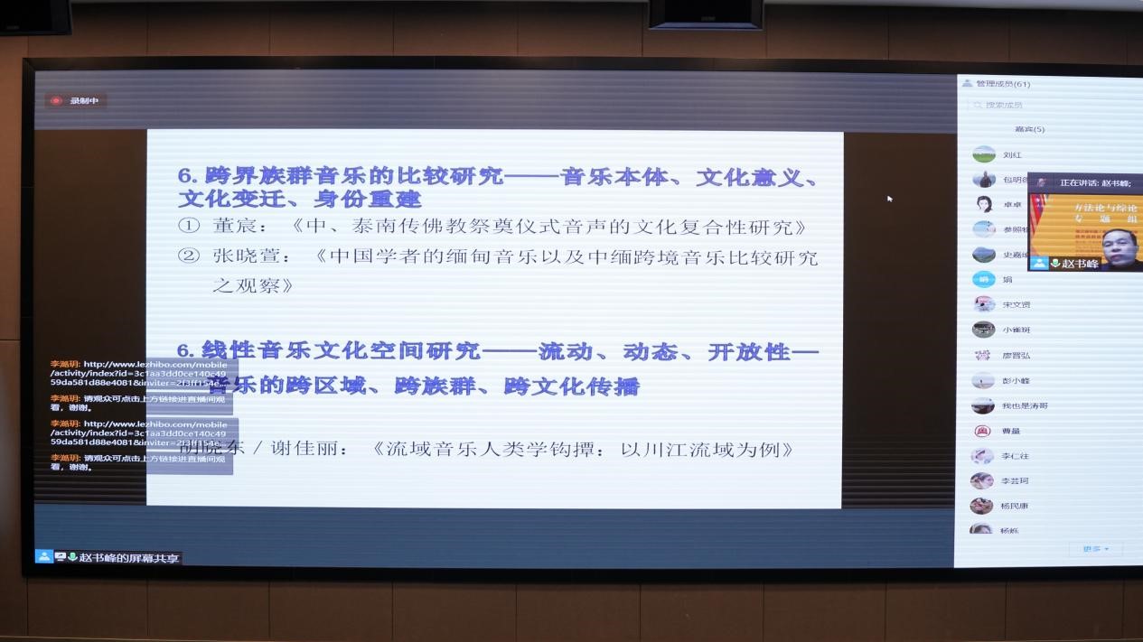 湖南师范大学pg娱乐电子游戏官网入口赵书峰教授对方法论与综论组进行评述与总结,从跨界族群音乐文化志、应用民族音乐学研究、历史民族音乐学研究、西方学者的跨界族群音乐研究、跨界族群音乐研究学术史回顾、跨界族群音乐的对比研究、线性音乐文化空间研究、乐器研究等方面进行了评述。同时对跨界族群音乐研究提出反思与展望,认为要加强历史民族音乐学研究、海外音乐民族志书写、海外研究文献的梳理与挖掘、跨界族群音乐研究的学术史梳理与总结,中国与周边国家跨界族群音乐研究的理论与方法,梳理跨界族群音乐文化的主要研究特色,与西方民族音乐学方法论之间有何异同。强调中国民族音乐学的关键词:跨界族群音乐研究、线性音乐、文化空间,疫情时代与后疫情时代海外音乐民族志研究,网络田野民族志、自媒体音乐民族志、微信田野民族志,学术内卷与民族志田野时间的缺失。