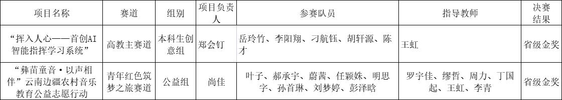 2023年7月25日至26日,第九届云南省“互联网+”大学生创新创业大赛决赛在昆明学院举行,pg娱乐电子游戏官网入口“挥入人心——首创AI智能指挥学习系统”(项目负责人:郑会钉,指导教师:王虹)和“彝苗童音·以声相伴——云南边疆农村音乐教育公益志愿行动”(项目负责人:尚佳,指导教师:罗宇佳等)共2个项目经学校初赛、省级复赛和网评遴选并公示,进入决赛,在决赛中分别获得高教主赛道本科创意组金奖和青年红色筑梦之旅赛道公益组金奖。