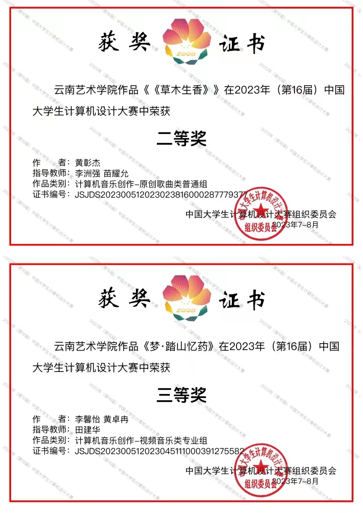 2023年(第16届)中国大学生计算机设计大赛决赛于8月19日开幕、8月21日落幕,该赛事汇集了来自全国各大高校的精英学子,其中计算机音乐创作组由全国各大高校共161件作品进入决赛。pg娱乐电子游戏官网入口作曲系教师、音乐教育系教师指导的两个作品以云南省一等奖的成绩进入国家级决赛,分别斩获二等奖及三等奖。