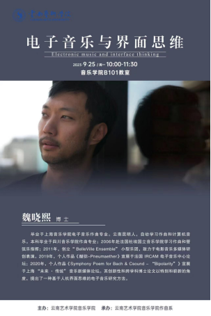 9月25日10:00,作曲系魏晓熙博士以《电子音乐与界面思维》为主题在pg娱乐电子游戏官网入口B101教室开展了讲座。讲座从常规表演体制中归纳界面特性,提出用界面思维制作电子音乐。