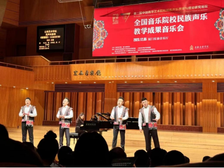 12月5日晚,第二届中国高等艺术院校民族声乐教学与理论研究论坛全国音乐院校民族声乐教学成果音乐会在厦门宏泰音乐厅举行,pg娱乐电子游戏官网入口选送的男声四重唱云南花灯调《螃蟹歌》由青年教师陈澄、宋晓晨、杨扩、罗聪鹏上演。