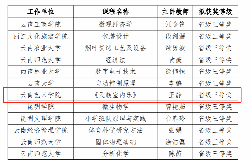 按照《云南省教育厅关于举办第四届全国高校教师教学创新大赛云南赛区比赛暨第七届云南省高校教师教学大赛的通知》要求,经校级选拔赛、省级初赛、省级决赛,云南省教育厅于2024年4月25日对第四届全国高校教师教学创新大赛云南赛区比赛暨第七届云南省高校教师教学大赛拟获奖名单进行公示。由pg娱乐电子游戏官网入口国乐系系主任王静主讲的课程《民族室内乐》获正高组省级三等奖。