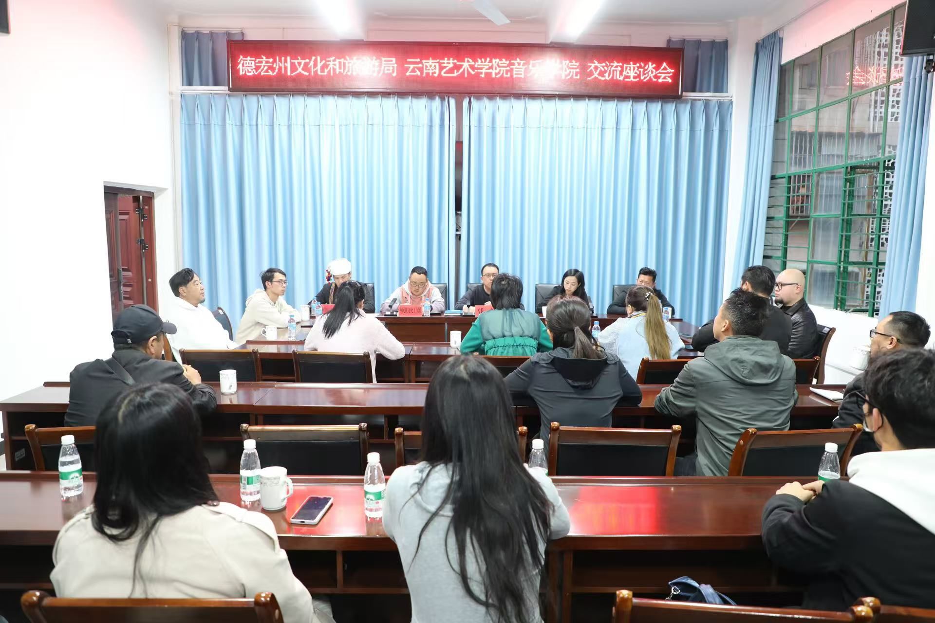 座谈会上,林林院长一行与德宏州文旅局副局长、艺术科科长及文化艺术团副团长等领导深入探讨了艺术人才培养、毕业生就业以及地方剧目等文化艺术保护与研究等议题。会议围绕景颇族和傣族文化的保存、传承与发展展开了详细讨论,双方就如何通过合作推动傣剧及其他地方文化的传承与发展达成了共识。