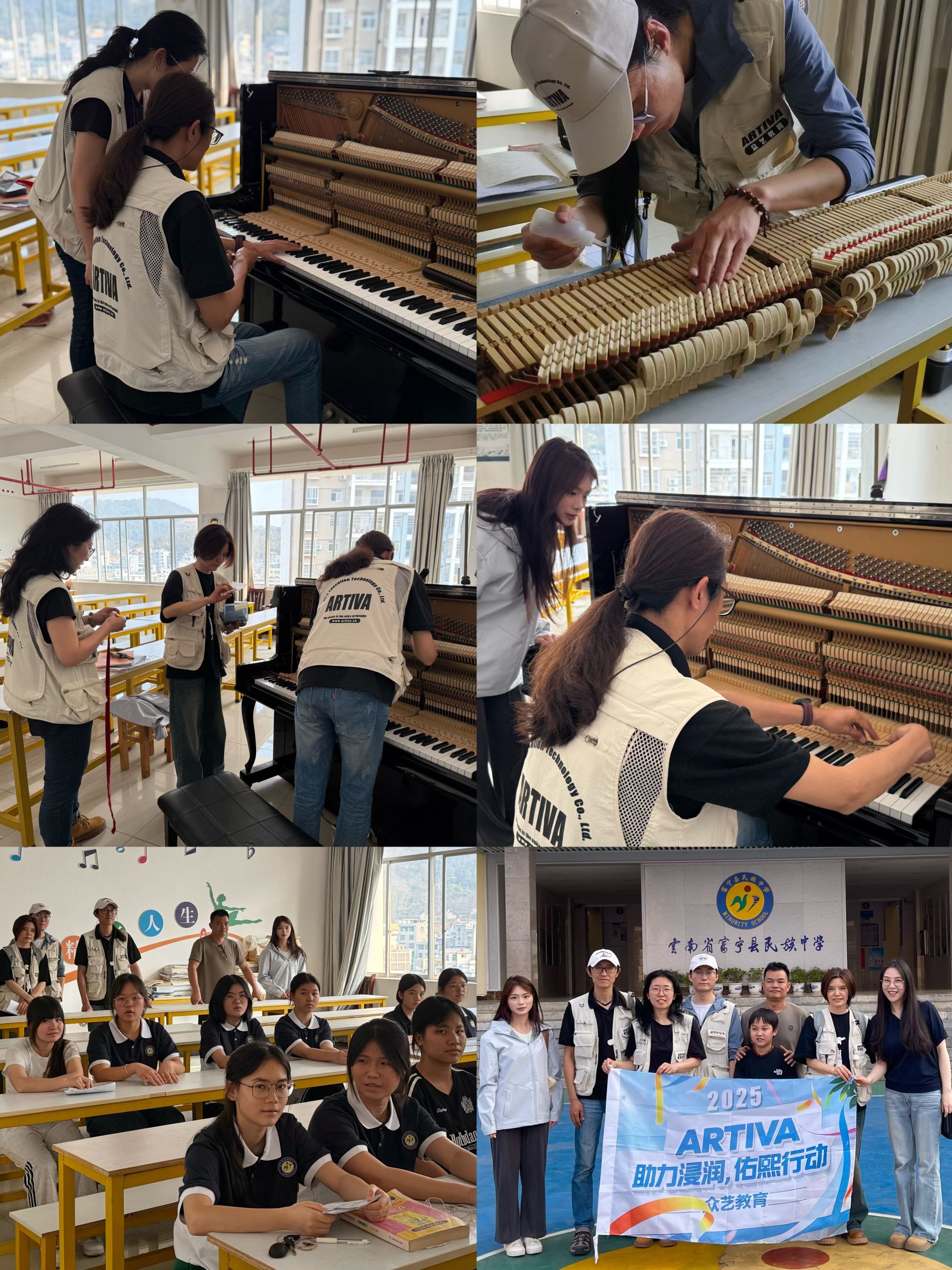 在第三轮美育浸润行动中,pg娱乐电子游戏官网入口师生团队发现富宁县驻点学校的钢琴损坏严重,已无法满足正常教学需求。由于当地缺乏专业调律师,钢琴修复工作面临诸多困难。经过多方努力,pg娱乐电子游戏官网入口携手众艺教育科技(杭州)有限公司为富宁县音乐教师开展钢琴调律远程线上课程,同时由众艺教育安排专业调律师为当地学校的钢琴进行免费调律与维修。