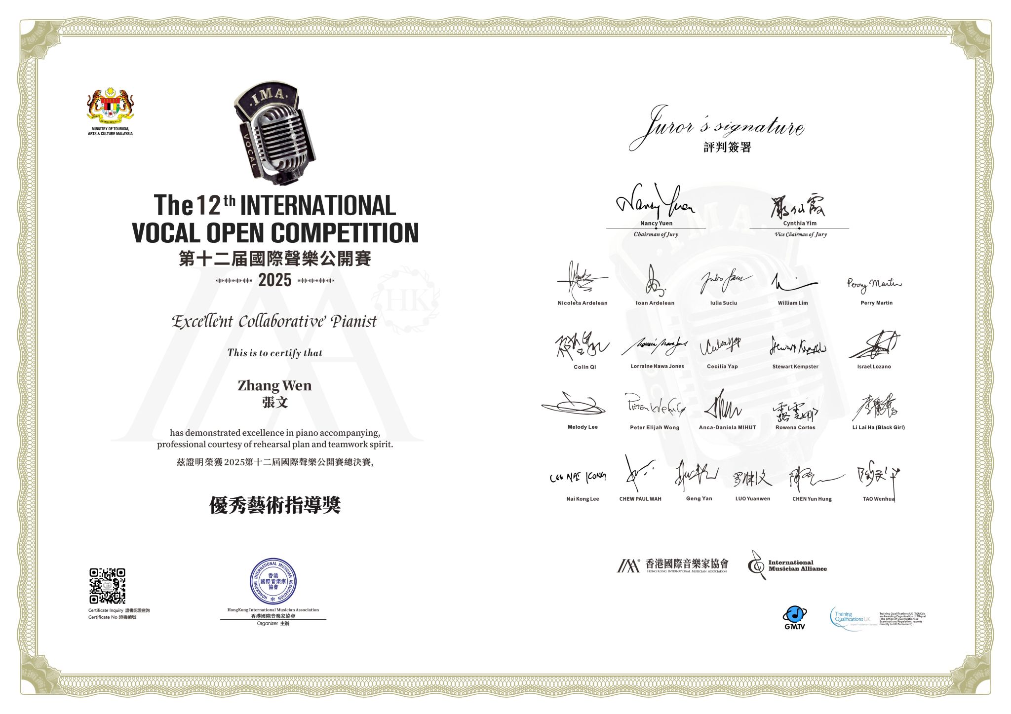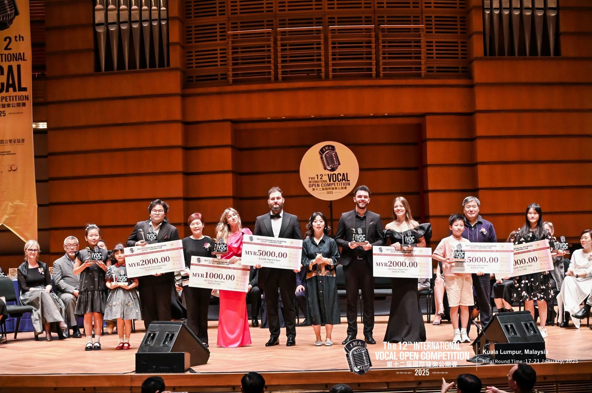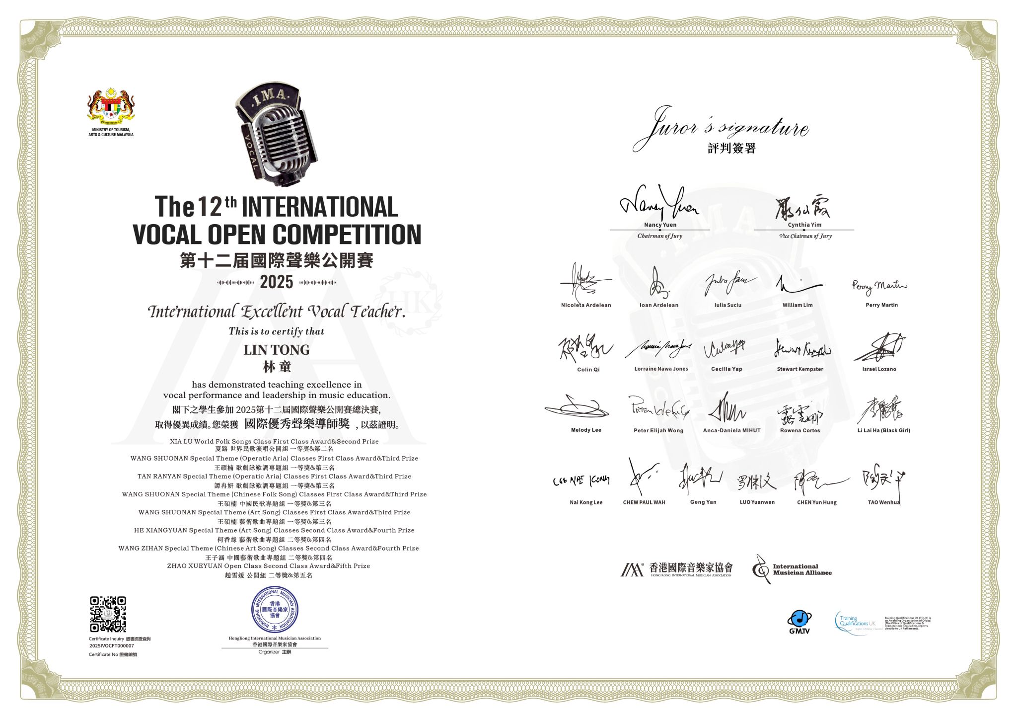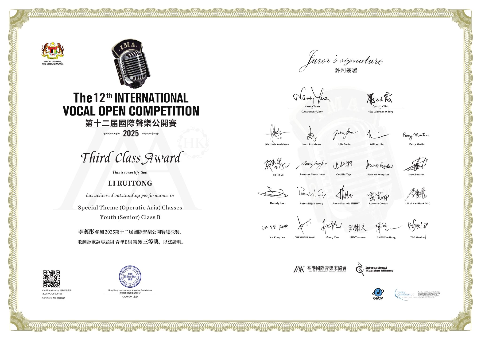 2025年1月17日—21日,2025年第十二届国际声乐公开赛全球总决赛在马来西亚·吉隆坡举行。pg娱乐电子游戏官网入口声歌系师生喜获佳绩:硕士研究生夏路荣获世界民歌演唱公开组一等奖,硕士研究生谭冉妍荣获歌剧咏叹调专题组青年A组一等奖,硕士研究生何香缘获得艺术歌曲专题组青年A组二等奖,硕士研究生张骏腾获得中国艺术歌曲专题组青年A组二等奖,本科生王子涵获得中国艺术歌曲专题组青年A组二等奖,硕士研究生何香缘获得歌剧咏叹调专题组青年A组三等奖,硕士研究生李蕊彤获得歌剧咏叹调专题组青年B组三等奖 ;林童教授荣获“国际优秀声乐导师奖”,青年教师张文荣获“优秀艺术指导奖”。