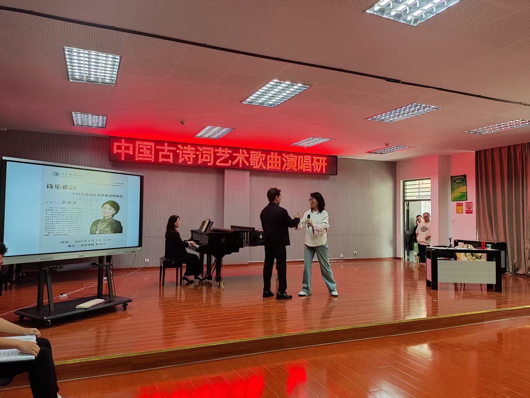 余惠承教授现场对几位同学演唱的古诗词作品进行示范教学。她从吐字归韵、发声位置、情感表达、作品理解等方面对同学们的演唱做出了有针对性的指导。余惠承教授语言生动活泼、讲解深入浅出,现场教学立竿见影,赢得在座师生热烈的掌声和欢呼。