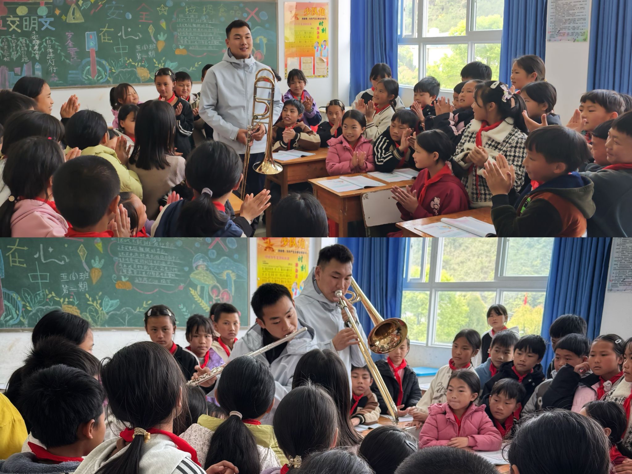 在田蓬中心小学,pg娱乐电子游戏官网入口管弦系王路通同学带来生动有趣的长号课堂演示。一曲《铃儿响叮当》悠扬奏响,孩子们兴致勃勃地围拢在教室中央,第一次近距离感受铜管乐器的独特魅力。课堂上,管弦系余茁奇同学手持长笛加入演奏,长笛与长号交织成和谐的旋律,进一步激发了学生们对音乐的浓厚兴趣。