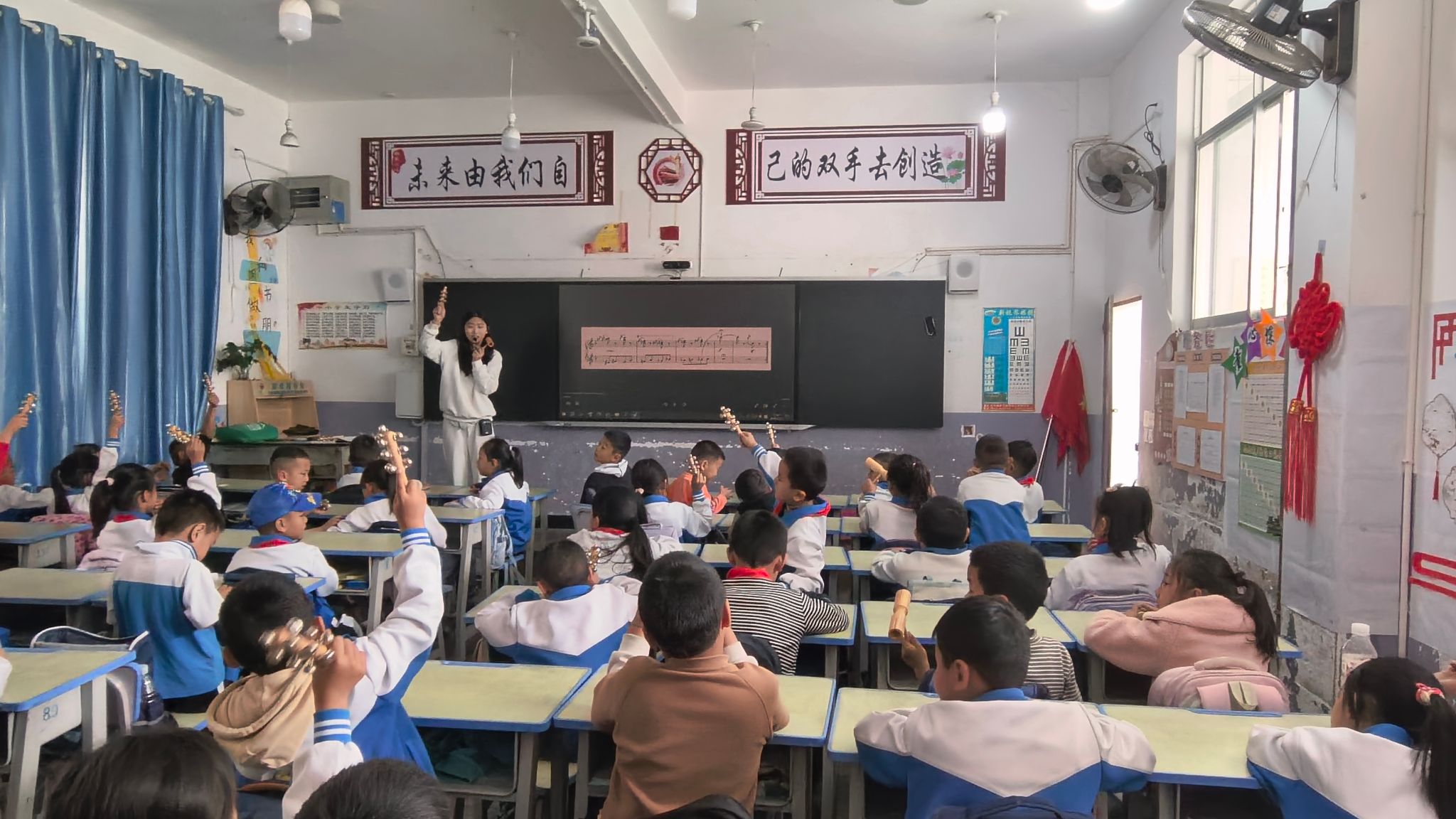 3月26日,团队在莲花塘小学开展支教学生教研活动,绳红楠指导二年级3班学生为穆索尔斯基《图画展览会—鸟雏的舞蹈》即兴配乐,通过实践感受音乐与画面的融合。