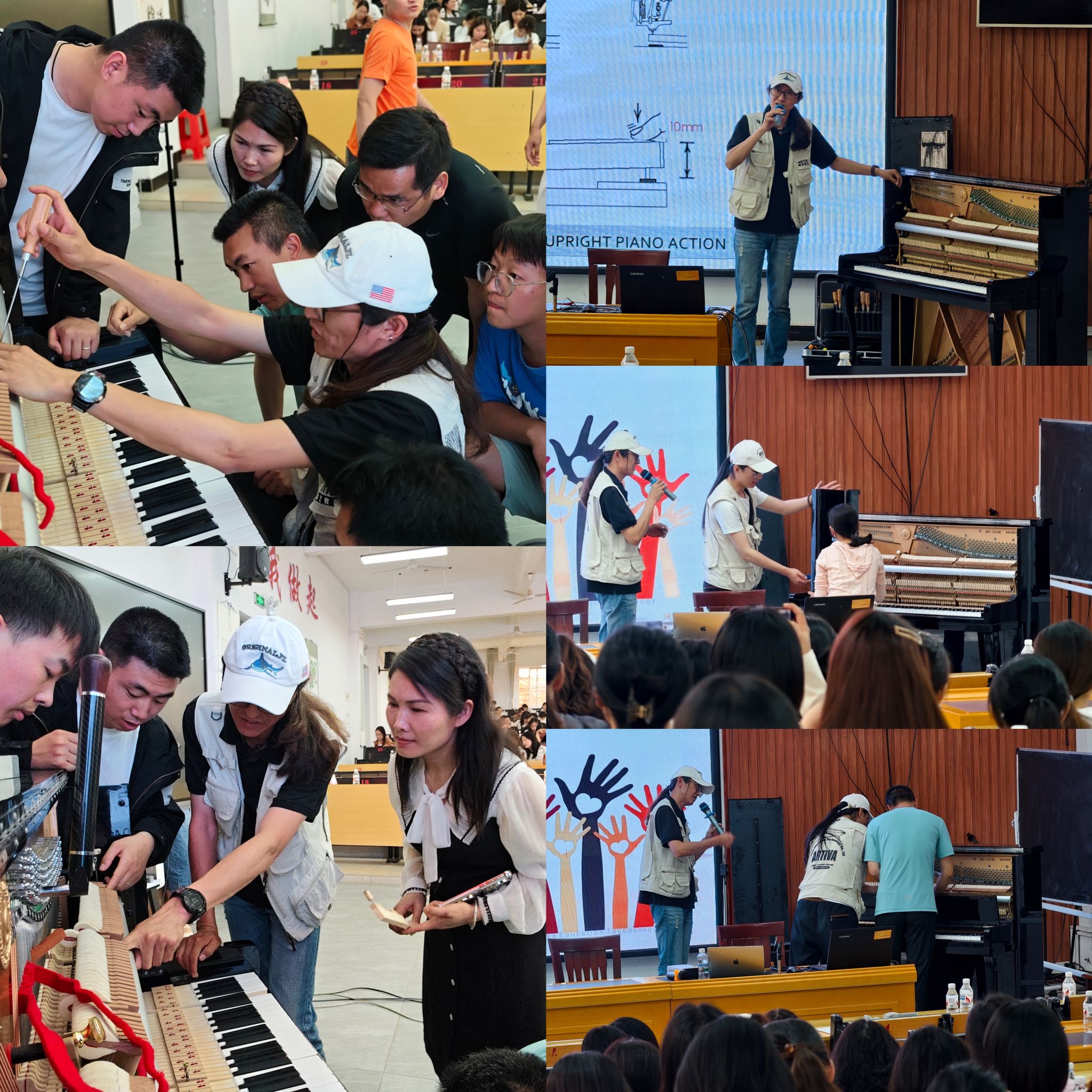 在讲座开场阶段,肖冬老师从钢琴的内部构造和机件系统切入,讲解了从琴键输入到琴槌击弦、音板共鸣的完整结构机制。他指出:“钢琴调律不仅是精细的技术操作,更是音乐美感的精准体现。”同时,他提醒学校应科学规划琴房空间,避免潮湿和阳光直射等不良环境,并强调定期调律对保障教学质量的重要性。