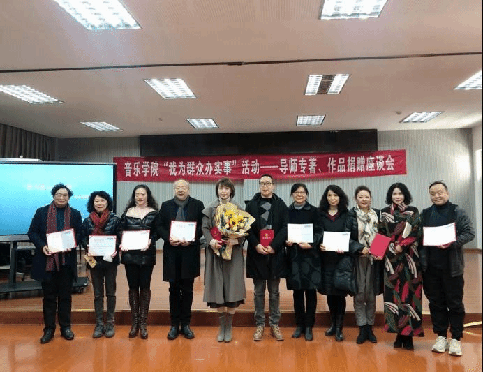 座谈会上,杨丽菲老师捐赠个人专著《声乐艺术原理与美学思想的传达》,通过讲述自己创作的心路历程来缅怀恩师;王晓康老师捐赠个人专著《男高音教学曲目选编》及演唱专辑《我的太阳》,并讲述了本著作的创作初衷,以及对声乐艺术的展望;孙芳老师与师向宁老师为大家分享了各自在国外的求学经历与创作背景,并分别捐赠同名演唱专辑与专著《俄罗斯浪漫曲》、《罗西尼与莫尔拉奇歌剧序曲》;王硕老师捐赠的演唱专辑,多数是云南本土民歌,宣传云南民族音乐文化;段继敏老师与李艳芳老师分别捐赠个人专著《中国唱法的基础训练》、《嗓音训练与歌唱技巧》、《西方声乐发展史》、《中国声乐发展史》与演唱专辑,讲述了歌唱、发声等专业知识,希望同学们可以通过著作得到更好的启发;王汉发老师捐赠个人原创歌曲精选集《鲲鹏展翅的祖国》,该书围绕“祖国之恋”、“华夏情韵”、“情深义重”、“花朵芬芳”、“母校情深”五个部分进行创作,并由学生对其中曲目进行现场展示;范琴雯老师捐赠专著《云南原创钢琴作品演释》,书中所有曲目均为云南本土作品,意在弘扬与传播云南音乐文化;黄凌飞老师捐赠个人专著《中国南传佛教音乐的人类学研究》,该书是国家社科基金项目结项研究成果,这为师生在今后的科研工作中树立了榜样;林林老师捐赠个人专著《声乐艺术的探索与创新》及演唱专辑《林歌林鹊》、《云南表情》,其中专辑《林歌林鹊》是林林老师在中国pg娱乐电子游戏官网入口就读硕士研究生时的毕业音乐会影像,另一部专辑《云南表情》中全部为云南本土音乐作品,这也为学生们在今后的表演中提供了大量的作品示范。