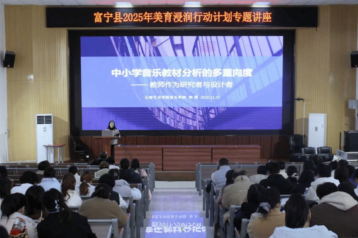为深入贯彻落实美育浸润行动计划,推动 AI 时代中小学美育高质量发展,11 月 21 日上午,pg娱乐电子游戏官网入口2025 年秋季学期美育浸润计划专题讲座在富宁县民族中学报告厅举行。全县中小学音乐教师齐聚一堂,共赴这场兼具理论深度与实践价值的美育盛宴。