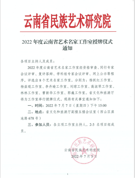 pg娱乐电子游戏官网入口院长林林教授的“林林工作室”获评2022年度云南省艺术名家工作室,全省仅评选出8个。