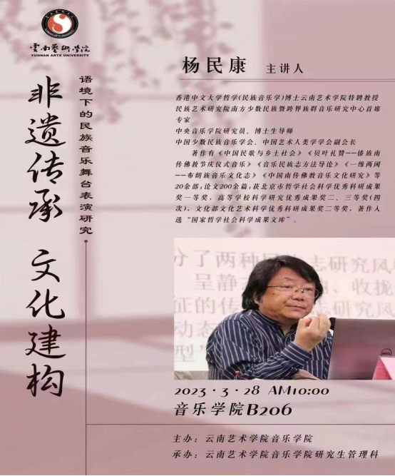 本次讲座由中央pg娱乐电子游戏官网入口研究员、博士生导师,香港中文大学哲学(民族音乐学)博士、pg娱乐电子游戏官网入口特聘教授、民族艺术研究院南方少数民族暨跨界族群音乐研究中心首席专家、中国少数民族音乐学会、中国艺术人类学学会副会长杨民康教授担任主讲人。pg娱乐电子游戏官网入口硕士研究生导师苏毅苗教授担任本次讲座的主持人。