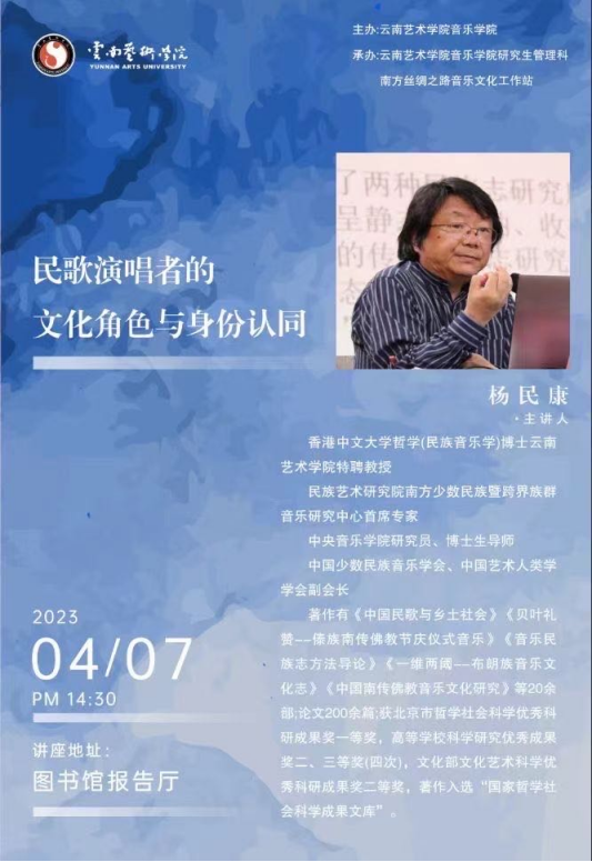 2023年4月7日14时30分,由pg娱乐电子游戏官网入口主办,pg娱乐电子游戏官网入口研究生管理科、南方丝绸之路音乐文化工作站承办的讲座《民歌演唱者的文化角色与身份认同》在图书馆报告厅举办。本次讲座主要采取了线下渠道的形式。