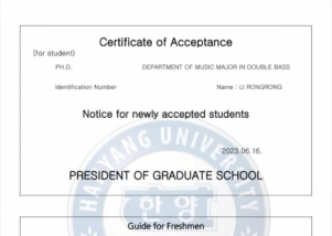 2023年6月,pg娱乐电子游戏官网入口2020级硕士研究生李蓉蓉获得了汉阳大学低音提琴独奏专业的博士研究生录取通知书。