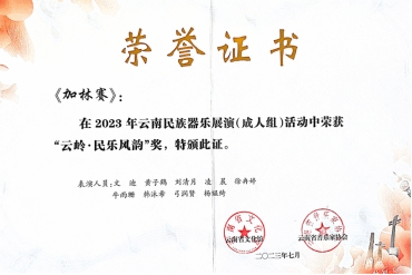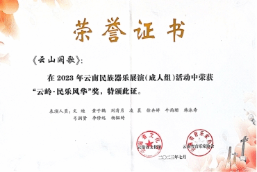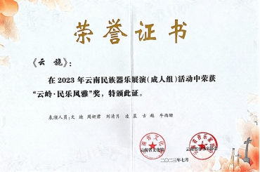 在云南省文化馆与云南省音乐家协会主办的“2023年云南民族器乐展演”中,pg娱乐电子游戏官网入口国乐系和作曲系教师尹毅、郭乐、高弘扬和赵云龙共同指导的“云上弦歌民族室内乐团”参与比赛并斩获佳绩比赛中,演奏高弘扬作曲的《云山阙歌》《云旎》和邹航编曲、梁聆聆改编的《加林赛》分别荣获成人组“云岭·民乐风华”(一等奖)、“云岭·民乐风雅”(三等奖)和“云岭·民乐风韵”(二等奖)。