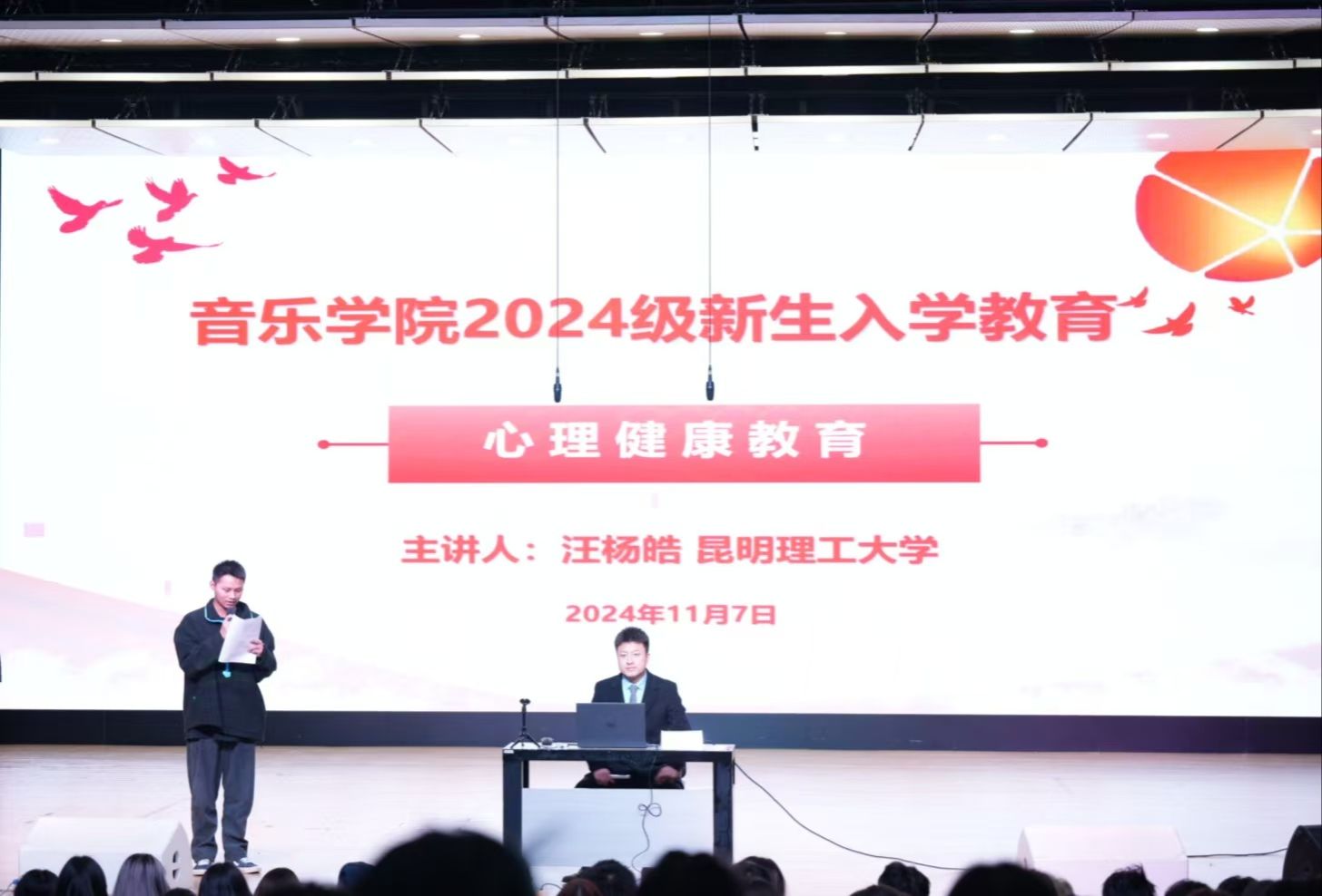 2024年11月7日晚19:30邀请了昆明理工大学汪杨皓老师为新生开展了题为“大学生活 从心开始”的心理健康教育讲座。讲座中汪老师引导新生关注心理健康,认识心理健康的重要性,并向新生们讲解了正确处理学习生活中遇到的心理问题的方法,提升了学生的心理健康素养。