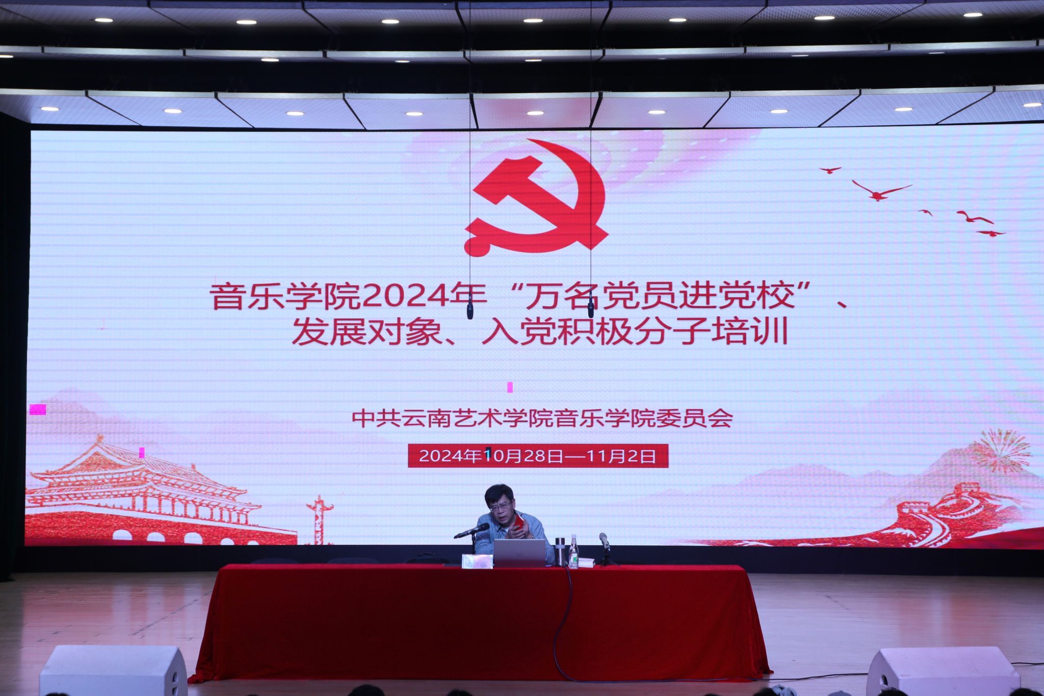 为深入学习贯彻习近平新时代中国特色社会主义思想和党的二十大、党的二十届三中全会精神及习近平总书记考察云南重要讲话精神,动员引领基层党组织和广大党员把思想和行动统一到党中央决策部署和省委、校党委工作要求上来,着力巩固深化党纪学习教育成果,不断提升入党积极分子、发展对象的政治素养。pg娱乐电子游戏官网入口于2024年10月28日在安康音乐厅举行2024年入党积极分子、发展对象暨“万名党员进党校”培训班开班仪式。pg娱乐电子游戏官网入口党委书记童汝全,马克思主义学院党总支书记李三强,pg娱乐电子游戏官网入口、舞蹈学院、影视学院、高职学院专职组织员,以及pg娱乐电子游戏官网入口全体党员、2024年备案的入党积极分子、发展对象,舞蹈学院和影视学院发展对象、高职学院入党积极分子,共计290人参加。pg娱乐电子游戏官网入口党委副书记、纪委书记肖本俊主持并提出培训纪律要求。