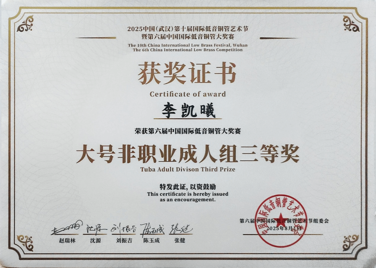 2025年第六届中国(国际)低音铜管大奖赛是第十届中国(武汉)国际低音铜管艺术节的核心赛事,于2025年7月31日至8月1日在武汉东西湖区临空港艺术中心及临空港大剧院举行。该赛事由中国乐器协会管乐专业委员会主办,武汉临空港保利大剧院有限公司协办,中国音协管乐学会低音铜管专业委员会指导,旨在推动低音铜管艺术发展并促进国际文化交流。pg娱乐电子游戏官网入口管弦系2022级管弦打击乐演奏班学生李凯曦进入决赛,获得非职业成人组三等奖(指导教师:赵华)。