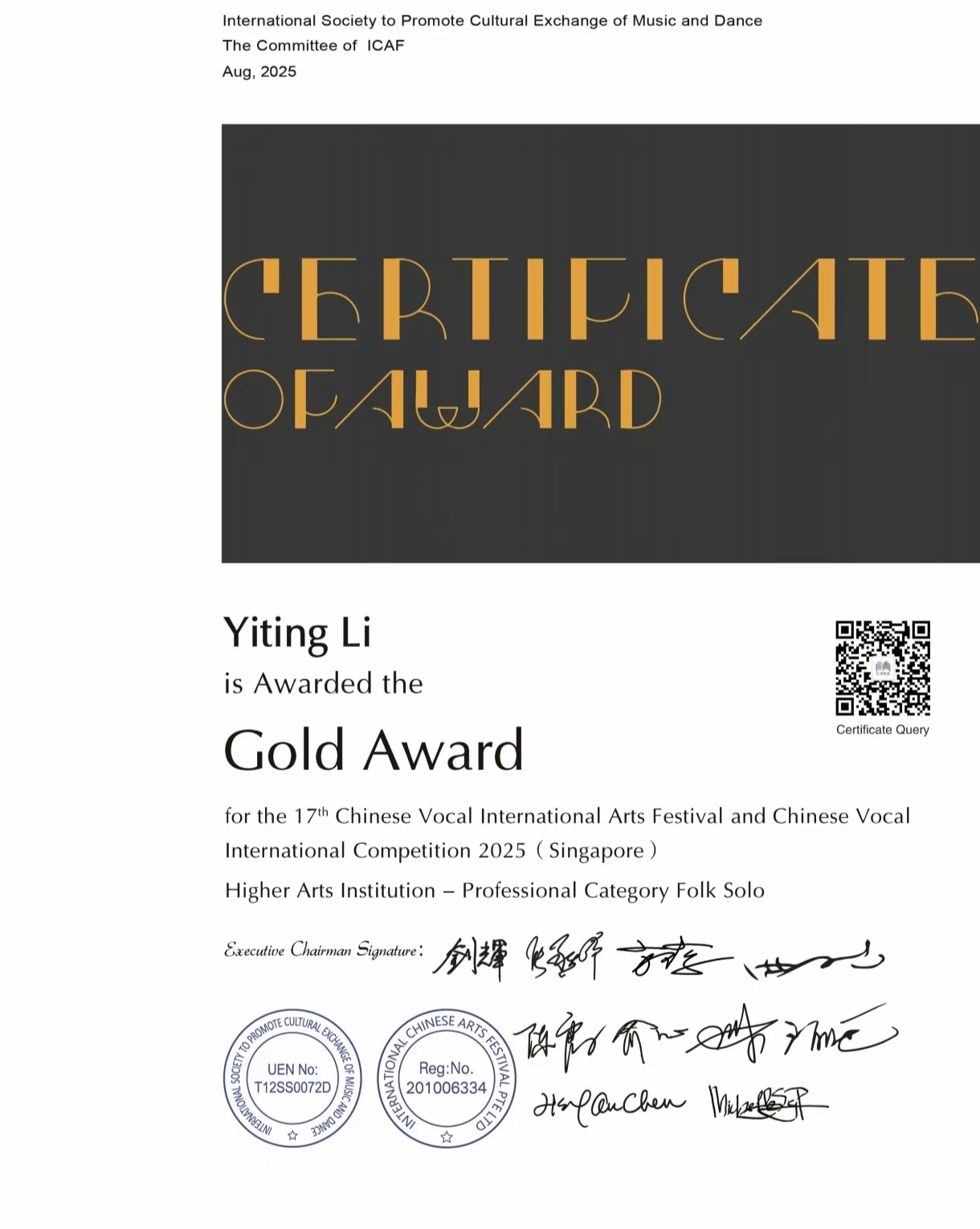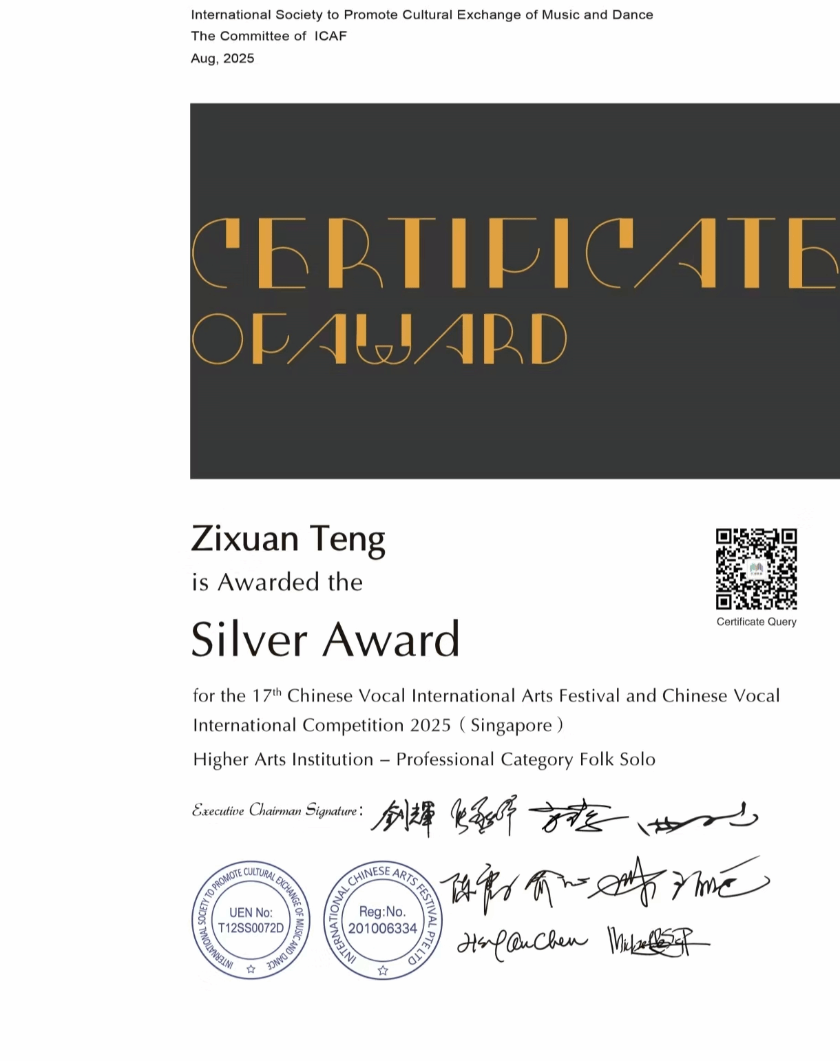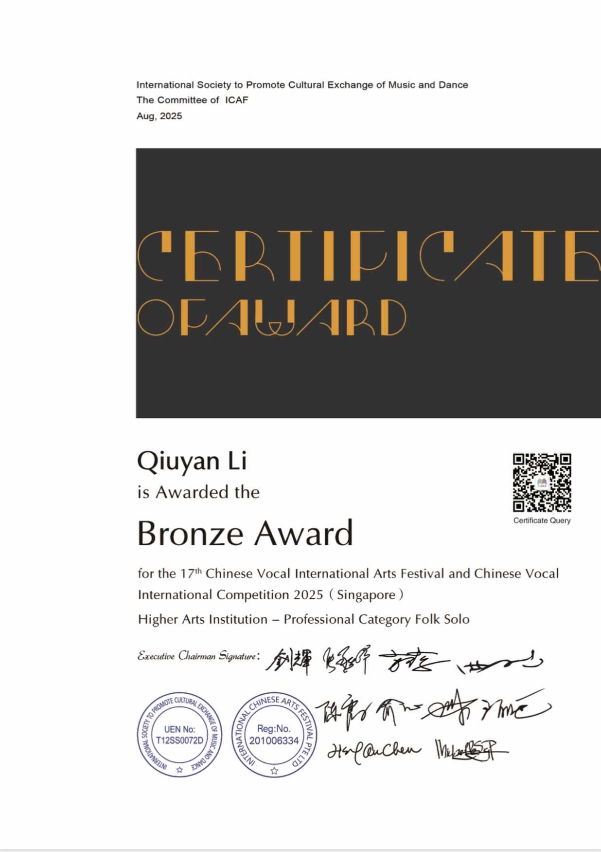 2025年8月7日-8月11日,由国际音乐舞蹈交流促进会主办的第十七届中国声乐国际艺术节暨中国声乐大赛在新加坡举办,中国声乐国际大赛以国际化、专业化著称,汇聚全球声乐领域的顶尖专家与优秀选手,被公认为当今华人声乐界最具权威和影响力的赛事之一。pg娱乐电子游戏官网入口声乐系师生共有7人获奖,其中金奖2人,银奖4人,铜奖1人。其中,声乐系教师付饶获专业组美声独唱项目金奖,2025届民族声乐班毕业生李秋妍获专业组民族声乐独唱项目铜奖(指导教师:林林),2023级民族声乐班张晓丫获专业组民族声乐独唱项目银奖(指导教师:林林),2024级民族声乐班荆艺歆获专业组民族声乐独唱项目银奖(指导教师:林林),2025届民族声乐班毕业生李以婷获专业组民族声乐独唱项目金奖(指导教师:陈红玲),2022级民族声乐班滕姿萱获专业组民族声乐独唱项目银奖(指导教师:陈红玲),2023级民族声乐班贾辰煜获专业组民族声乐独唱项目银奖(指导教师:陈红玲)。