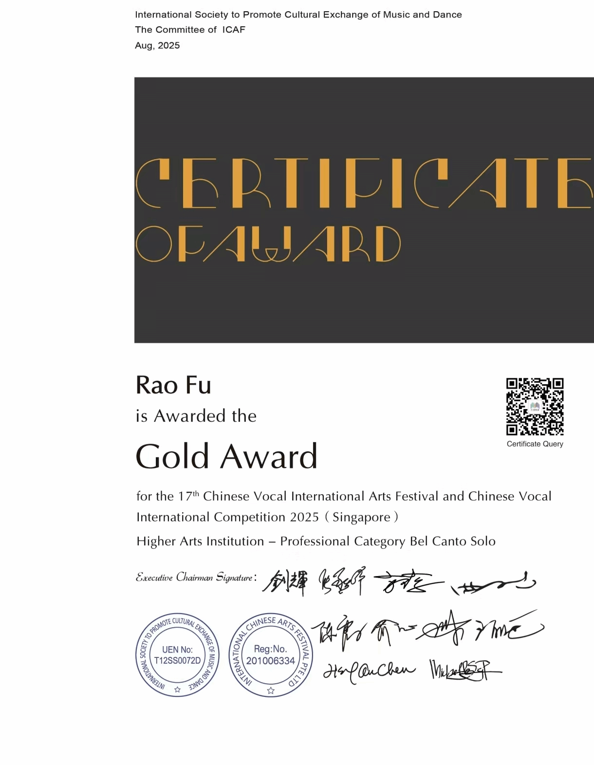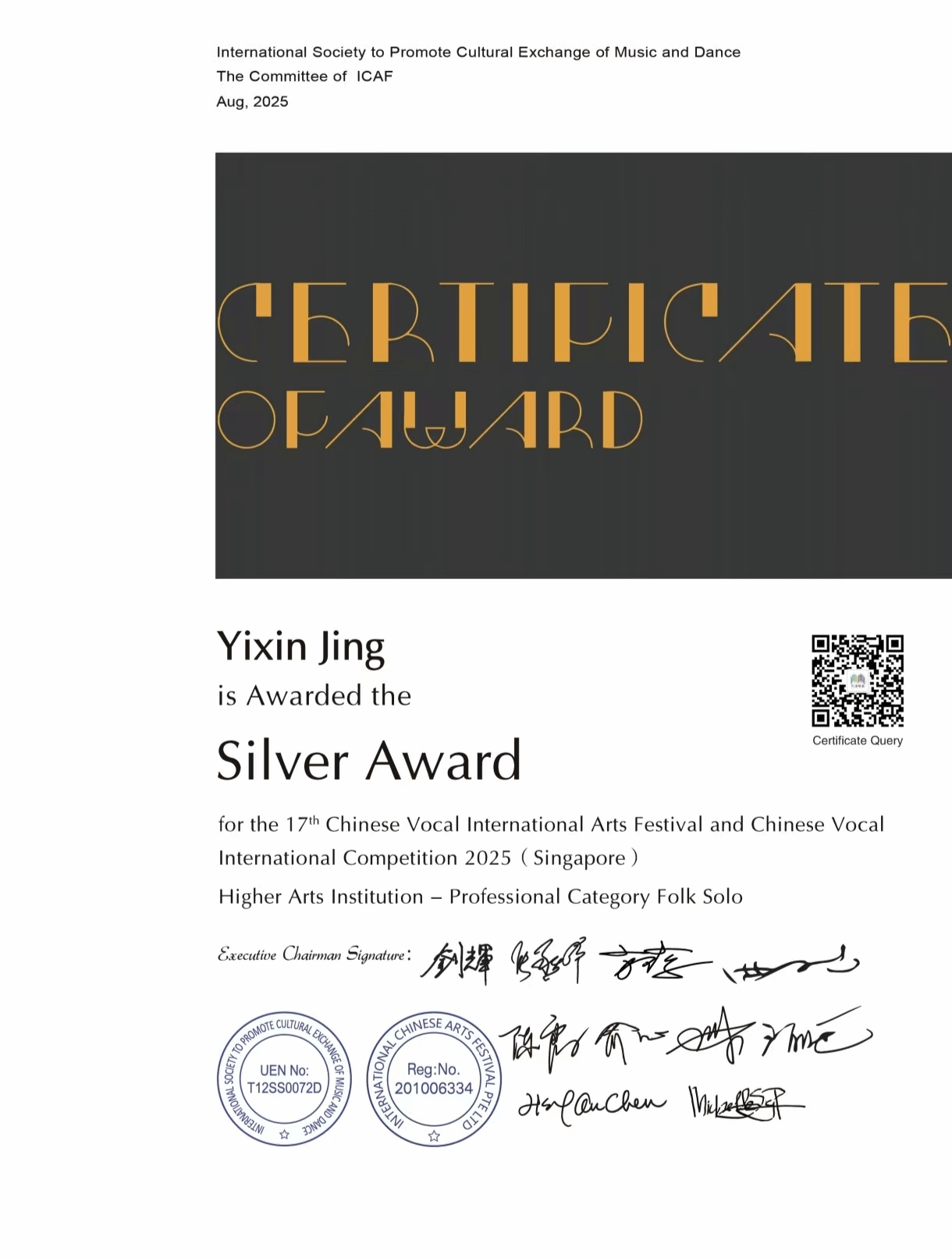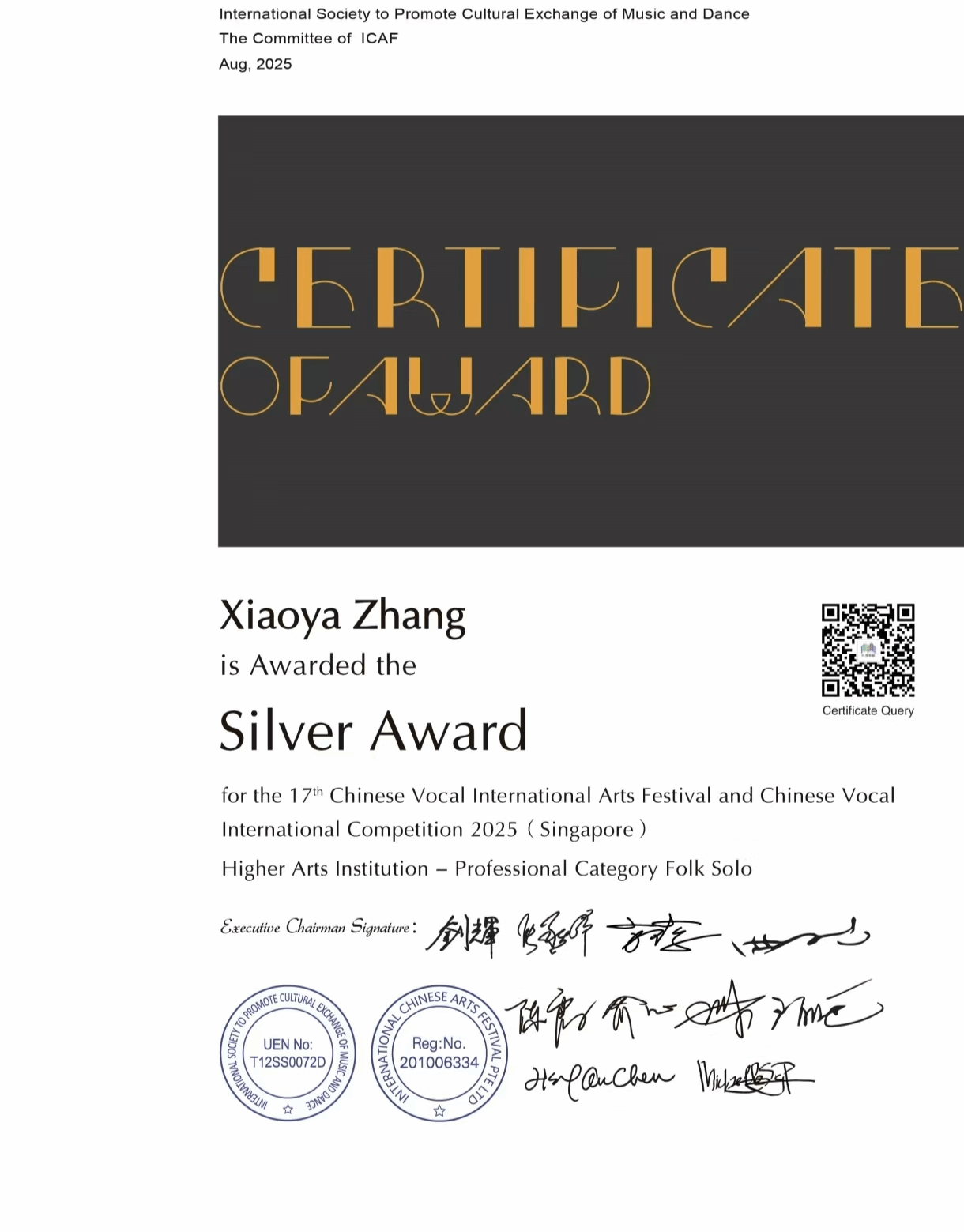 2025年8月7日-8月11日,由国际音乐舞蹈交流促进会主办的第十七届中国声乐国际艺术节暨中国声乐大赛在新加坡举办,中国声乐国际大赛以国际化、专业化著称,汇聚全球声乐领域的顶尖专家与优秀选手,被公认为当今华人声乐界最具权威和影响力的赛事之一。pg娱乐电子游戏官网入口声乐系师生共有7人获奖,其中金奖2人,银奖4人,铜奖1人。其中,声乐系教师付饶获专业组美声独唱项目金奖,2025届民族声乐班毕业生李秋妍获专业组民族声乐独唱项目铜奖(指导教师:林林),2023级民族声乐班张晓丫获专业组民族声乐独唱项目银奖(指导教师:林林),2024级民族声乐班荆艺歆获专业组民族声乐独唱项目银奖(指导教师:林林),2025届民族声乐班毕业生李以婷获专业组民族声乐独唱项目金奖(指导教师:陈红玲),2022级民族声乐班滕姿萱获专业组民族声乐独唱项目银奖(指导教师:陈红玲),2023级民族声乐班贾辰煜获专业组民族声乐独唱项目银奖(指导教师:陈红玲)。