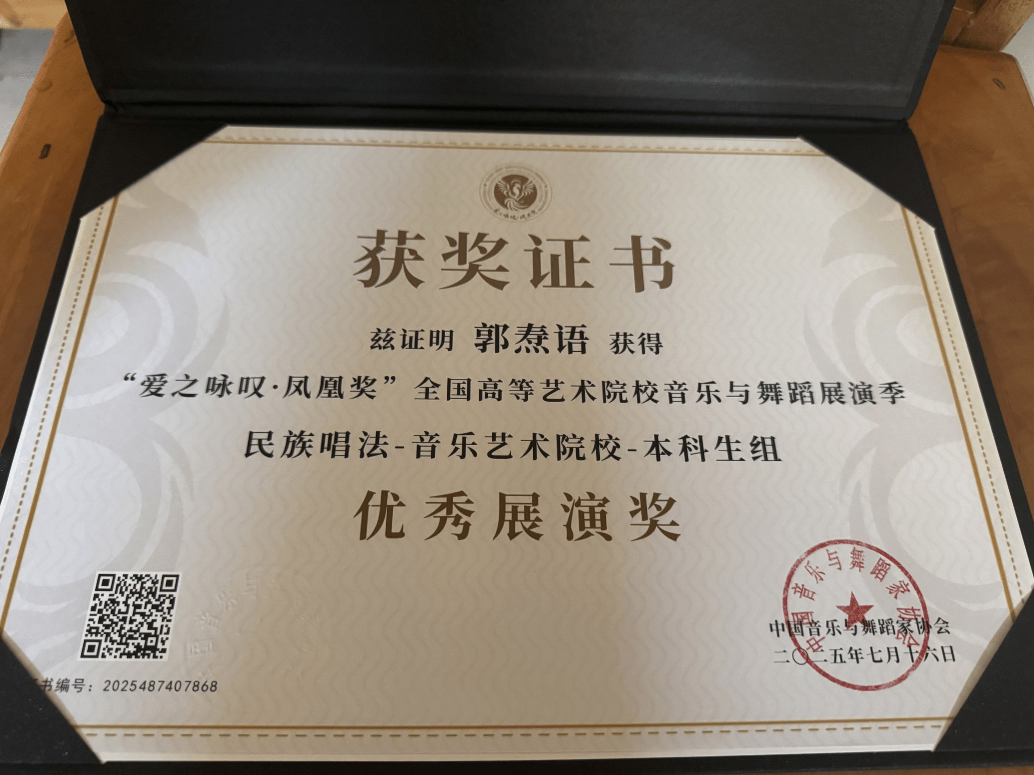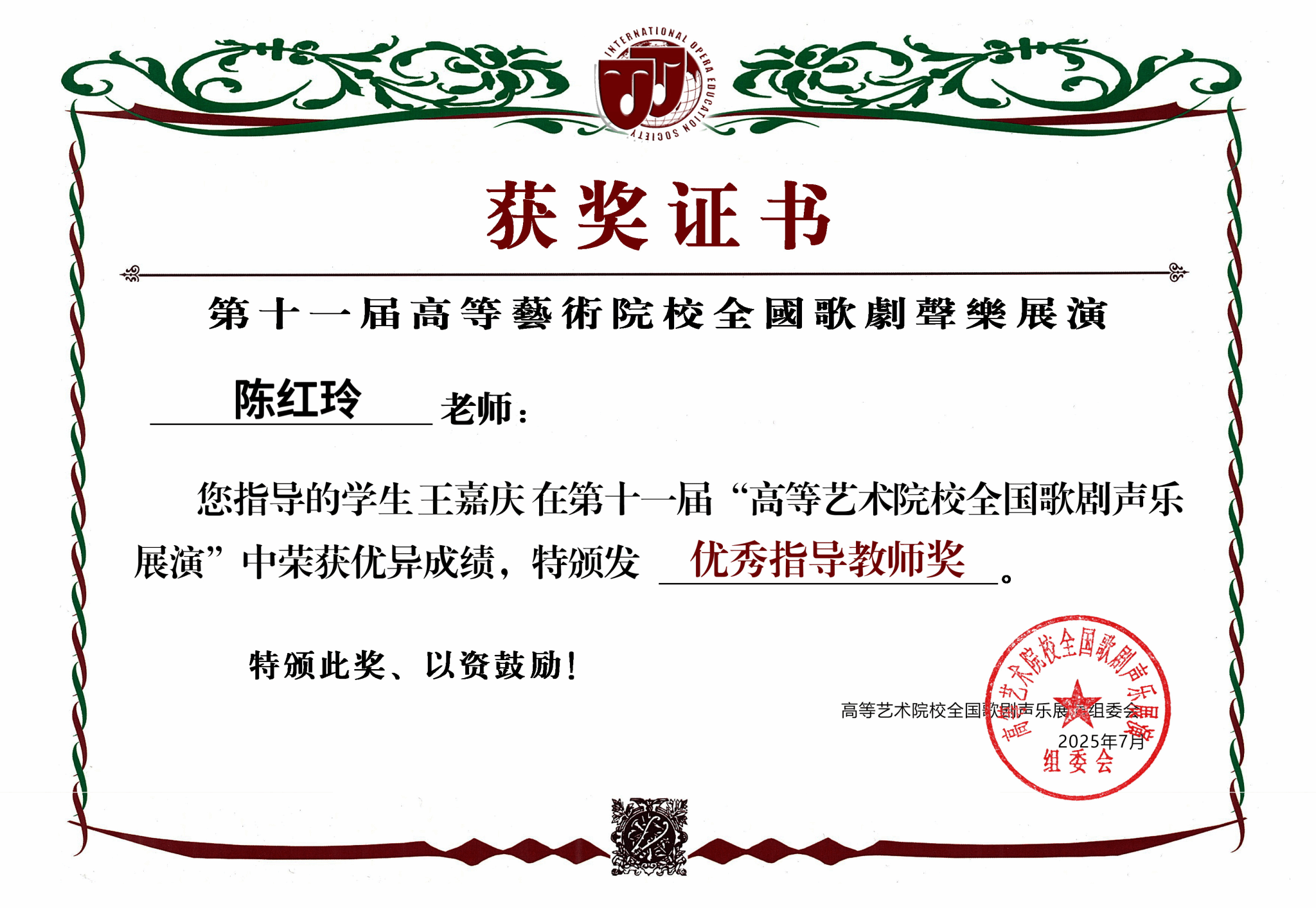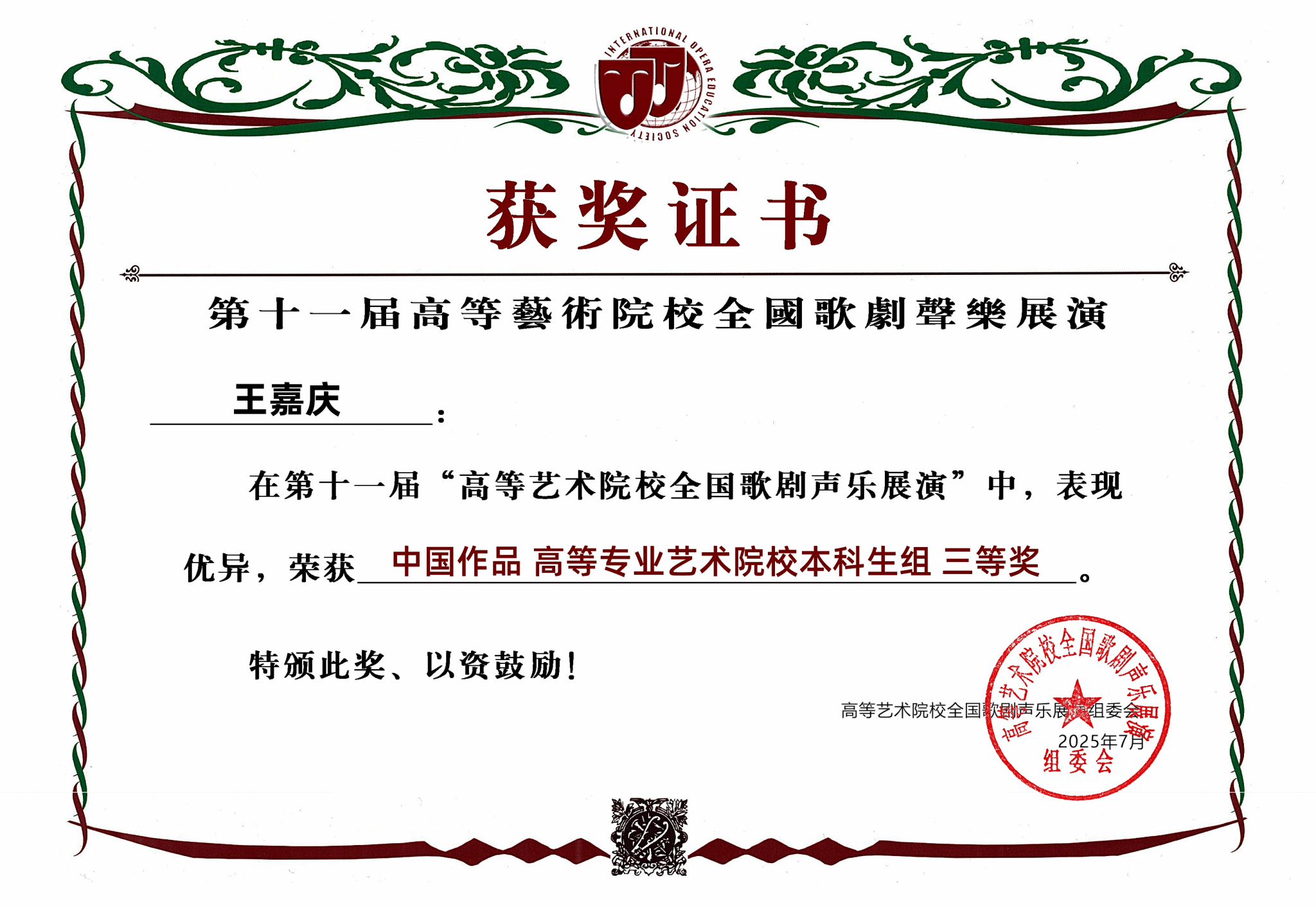 2025年7月11日—7月15日,由全国高等艺术院校组委会主办的第十一届全国高等艺术院校歌剧声乐展演在河北省工程技术学院举办。评审团由全国高等艺术院校及专业院团的歌唱家、教育家组成,本届展演吸引了来自全国31个省市自治区的740余名选手参加。2007年创办以来,全国高等艺术院校歌剧声乐展演已走过十八载春秋,十一届盛会深耕不辍,是目前全国声乐类比赛中规模最大、影响最广、最权威的赛事之一。pg娱乐电子游戏官网入口2025届民族声乐班毕业生王嘉庆荣获中国作品高等专业艺术院校本科生组三等奖,指导教师陈红玲老师获优秀指导教师奖。