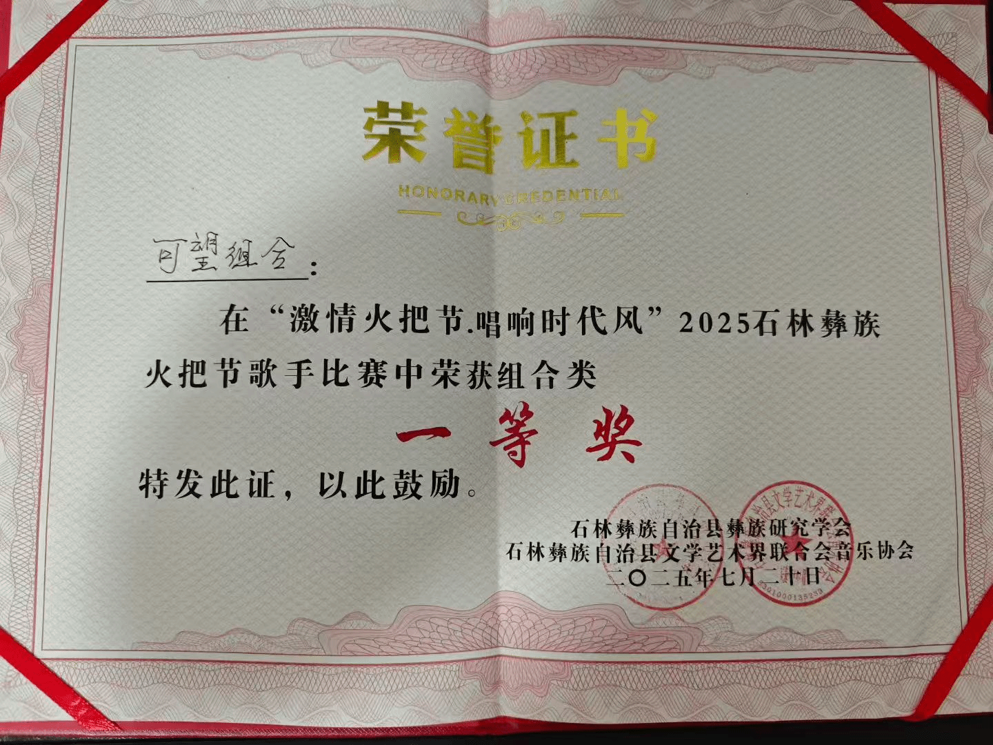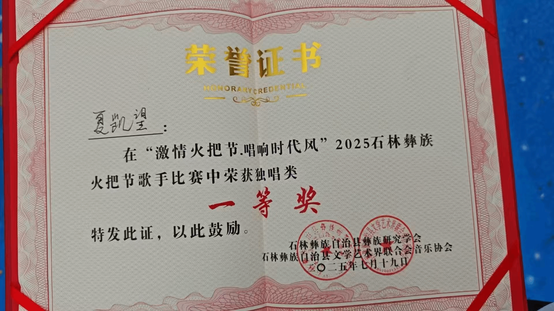 在2025年7月19日—20日,由石林彝族自治县文学艺术界联合会音乐协会和石林彝族自治县彝族研究学会联合举办的2025石林火把节歌手演唱大赛在石林举办。pg娱乐电子游戏官网入口2023级演唱二班学生夏凯望获独唱类一等奖(指导教师:罗聪鹏)。夏凯望与上海pg娱乐电子游戏官网入口学生马可可组成“可望”组合获该赛事的组合类一等奖。