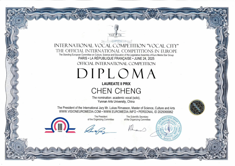 2025年6月28日—7月2日,由欧洲媒体之星联合会主办的“声乐之城”国际声乐比赛在法国巴黎举行。该比赛得到法兰西共和国和欧盟官方政府机构的认可,自1996年起,在EURO MEDIA STAR GROUP™控股公司的领导下举办视频比赛,是欧洲官方国际赛事之一。pg娱乐电子游戏官网入口声乐系教师陈澄荣获二等奖。