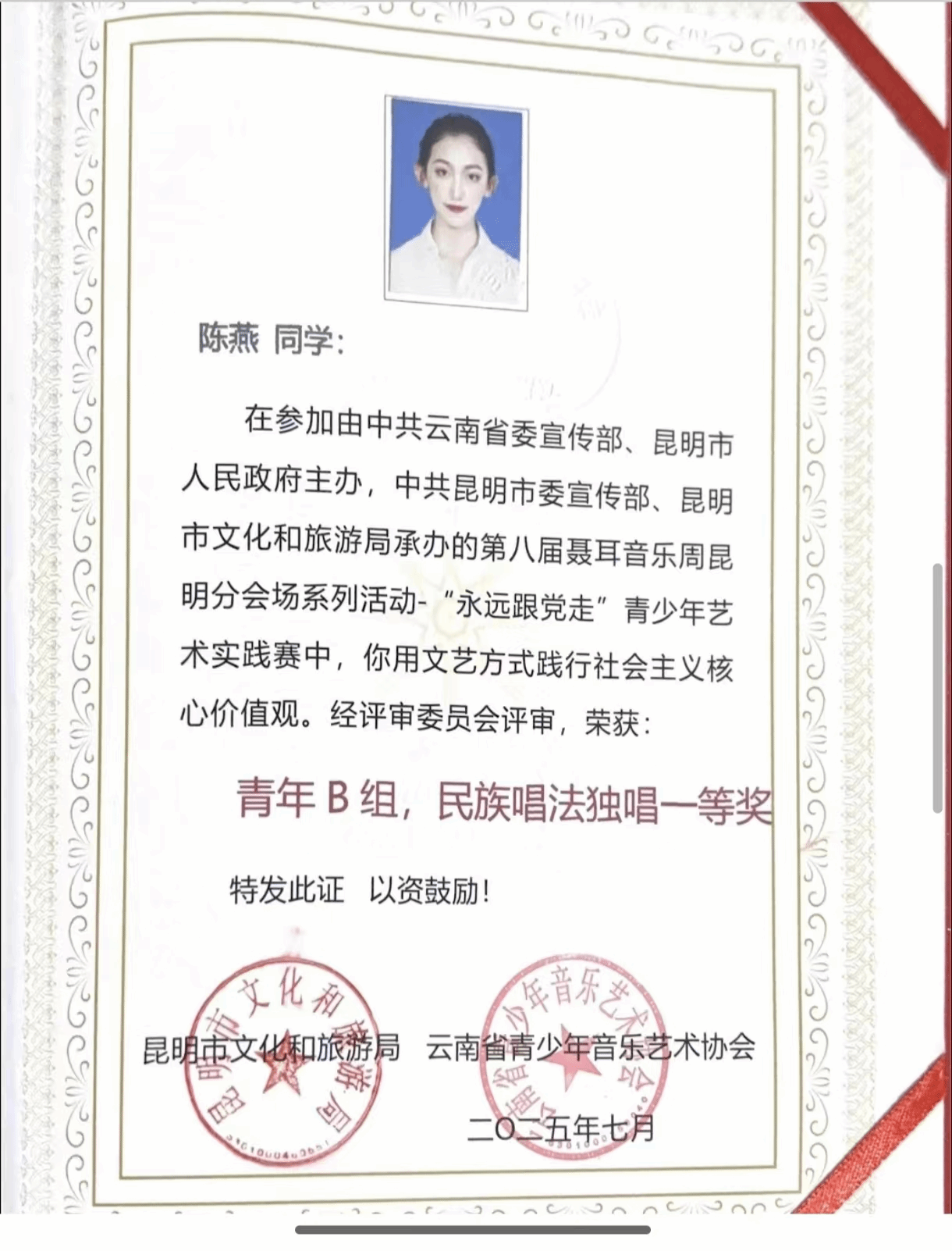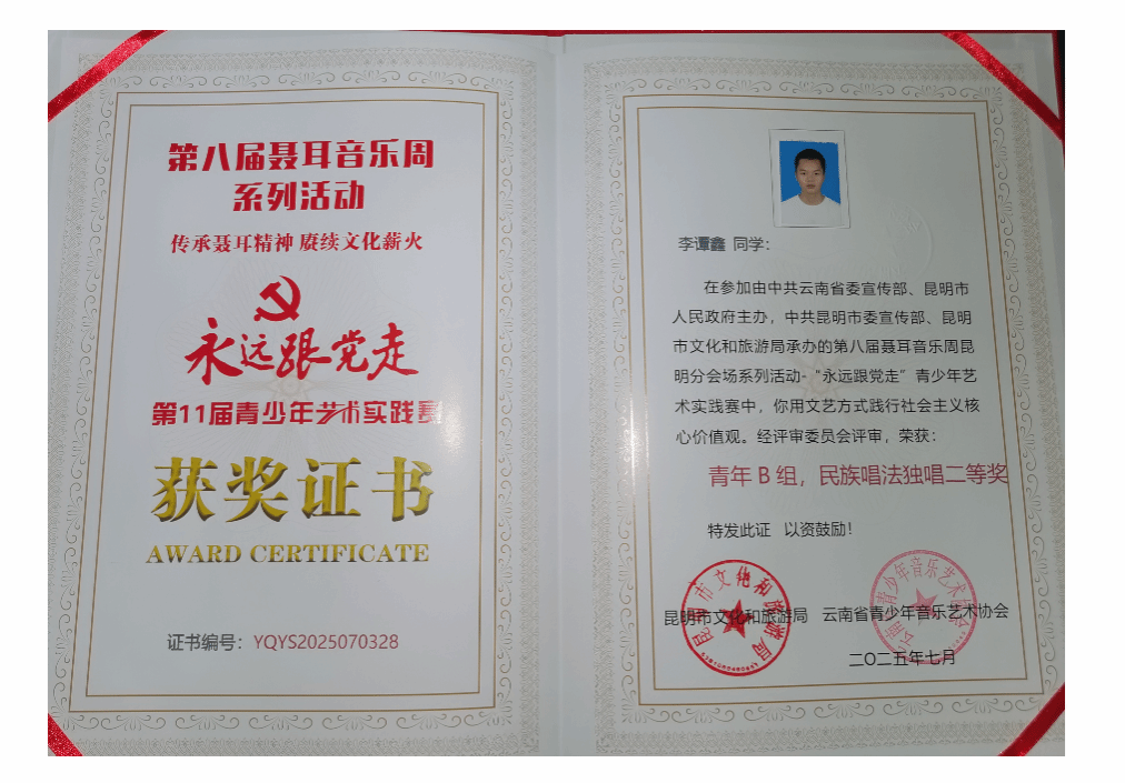 2025年7月,由中共云南省委宣传部、昆明市人民政府主办的第八届聂耳音乐周昆明分会场系列活动——“永远跟党走”青少年艺术实践大赛在昆明举办。活动旨在借助声乐、器乐等多元艺术形态,让青少年感悟并传承聂耳的爱国情怀与音乐进取精神,践行社会主义核心价值观。pg娱乐电子游戏官网入口声乐系获一等奖1名、二等奖1名。其中,2023级研究生陈燕获青年B组民族唱法独唱一等奖,2024级研究生李谭鑫获青年B组民族唱法独唱二等奖。