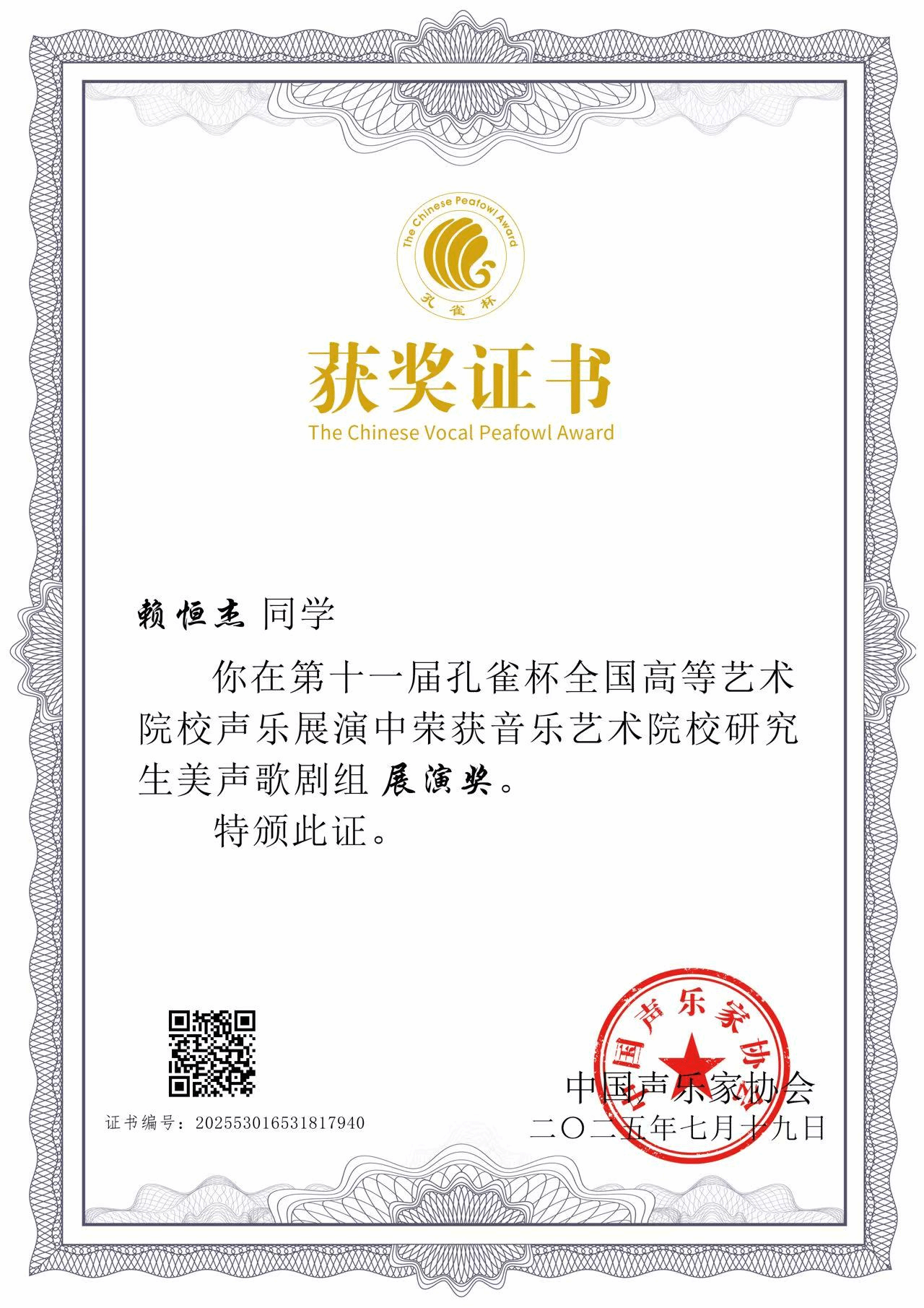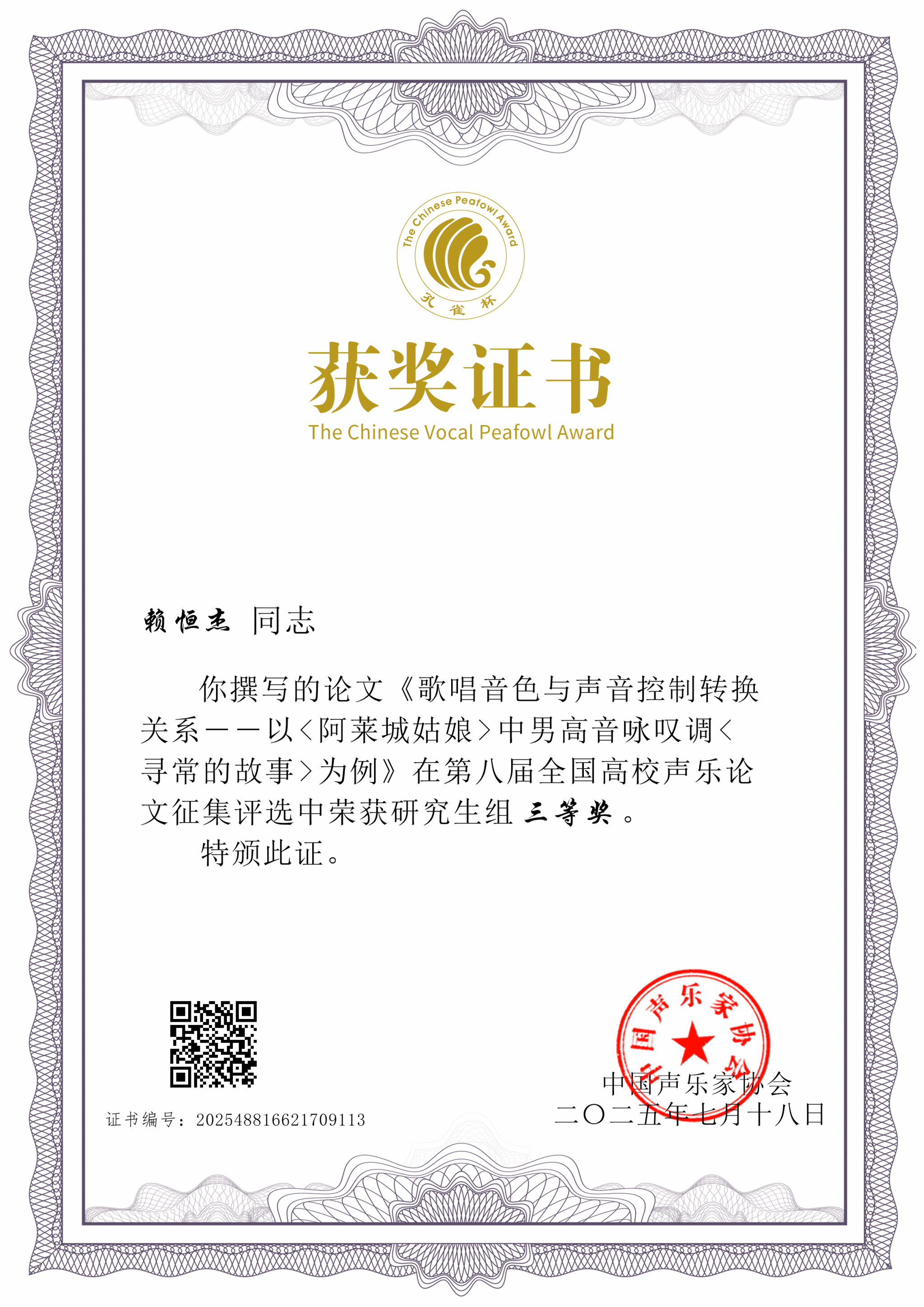 2025年7月18日—19日,由中国声乐家协会、广东省声乐艺术研究会、孔雀杯组委会主办的第十一届孔雀杯全国高等艺术院校展演以及第八届全国高校声乐论文征集评选在星海pg娱乐电子游戏官网入口举办。pg娱乐电子游戏官网入口2024级研究生赖恒杰荣获第十一届孔雀杯音乐艺术院校研究生美声歌剧组展演奖、第八届全国高校声乐论文征集评选研究生组三等奖。指导教师:张菲菲。