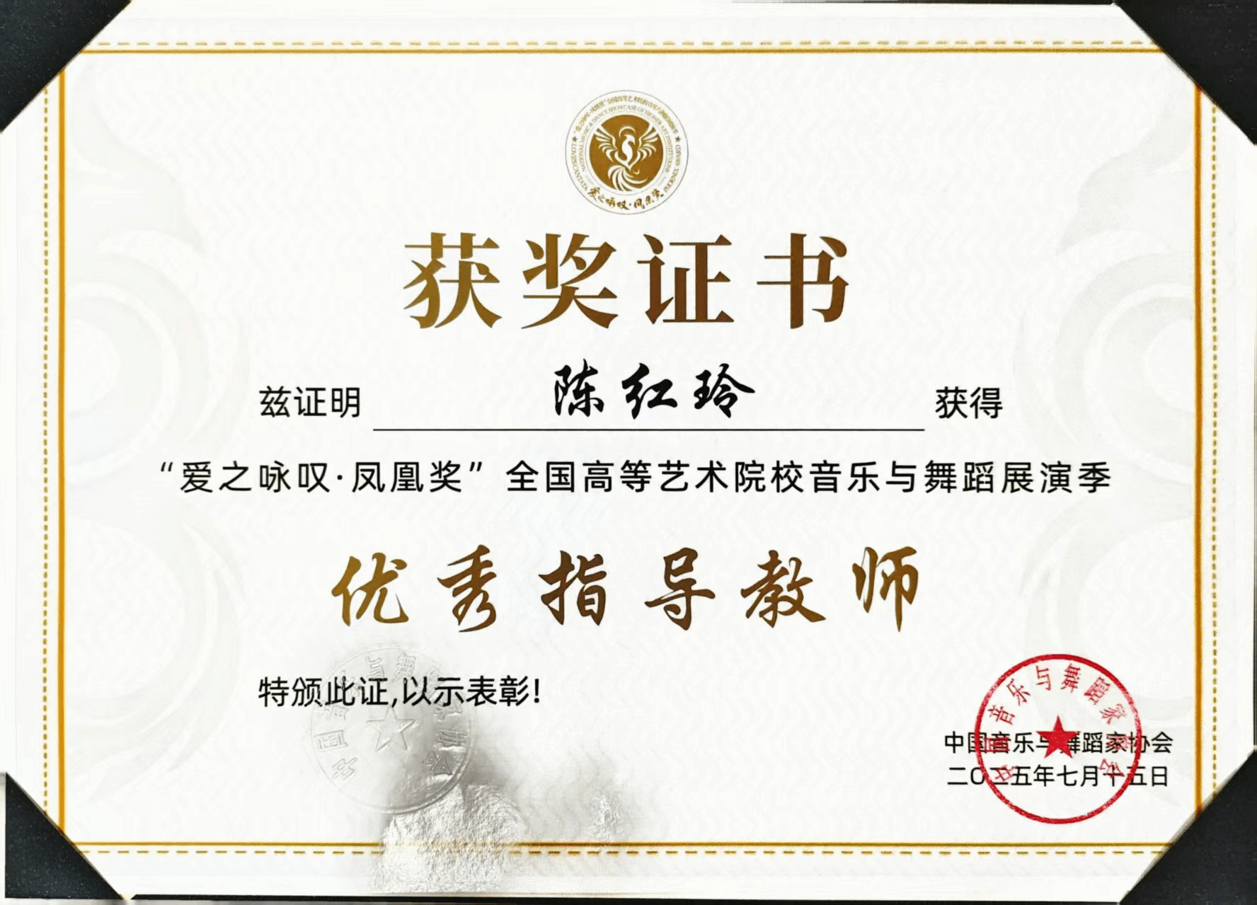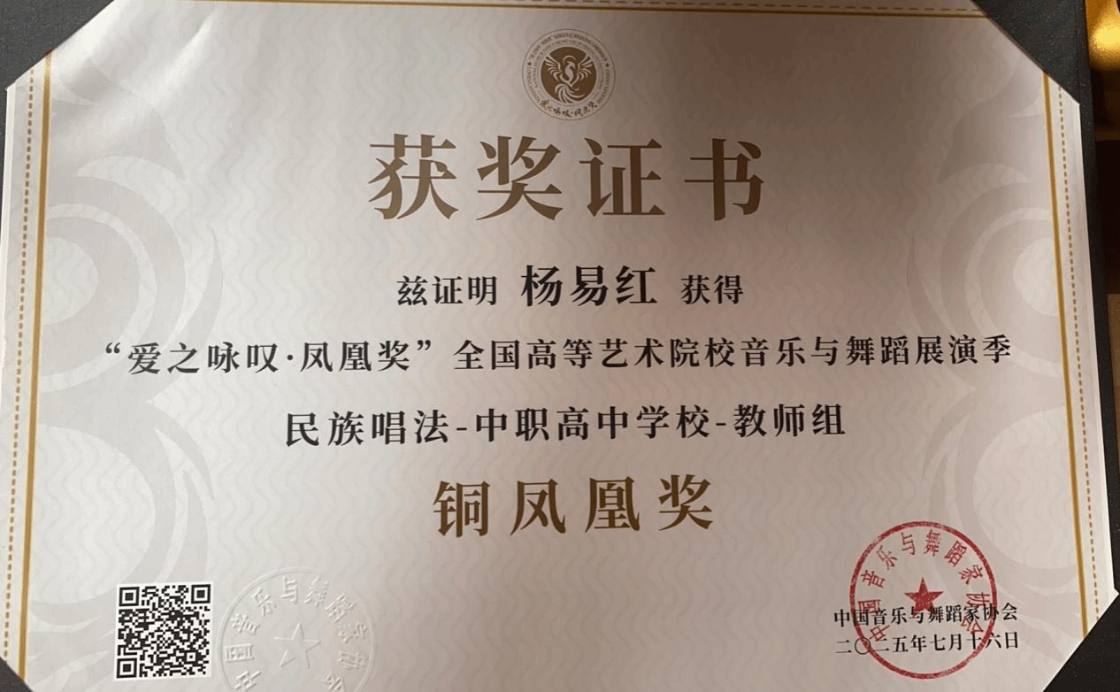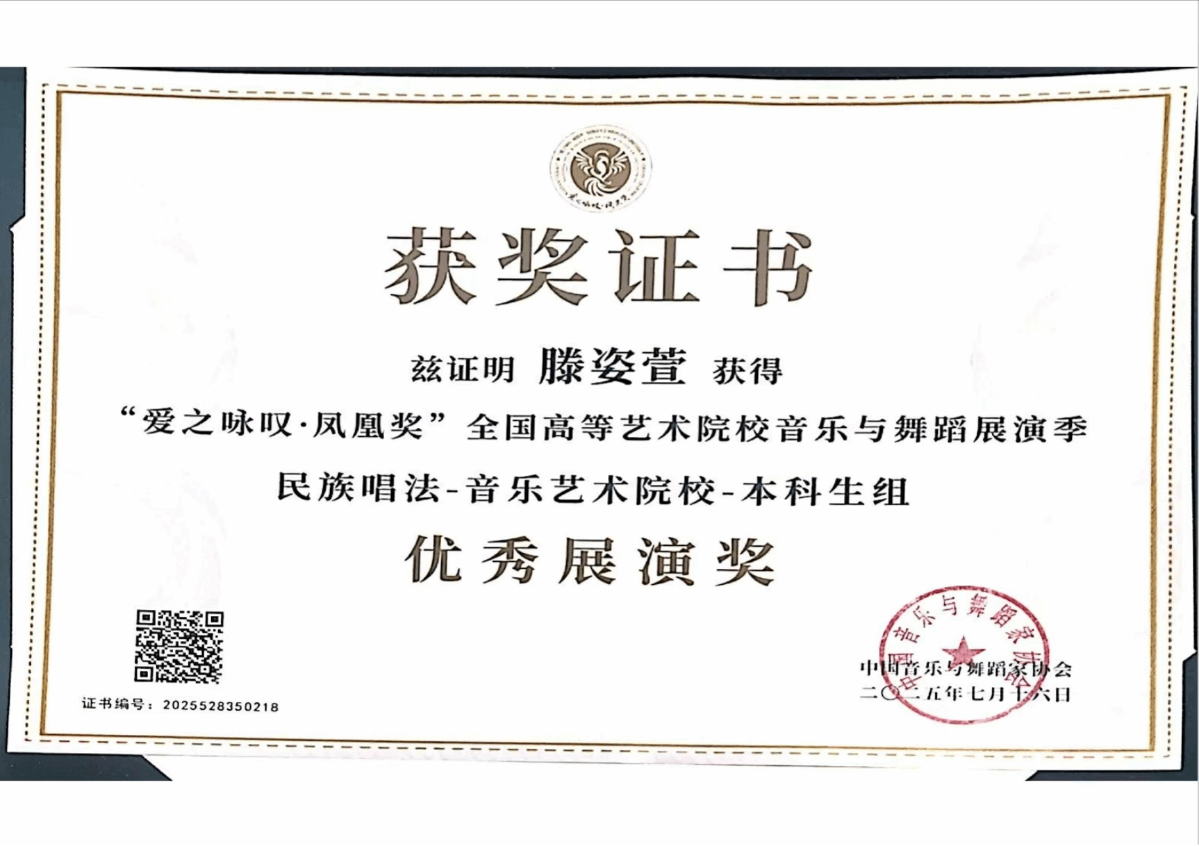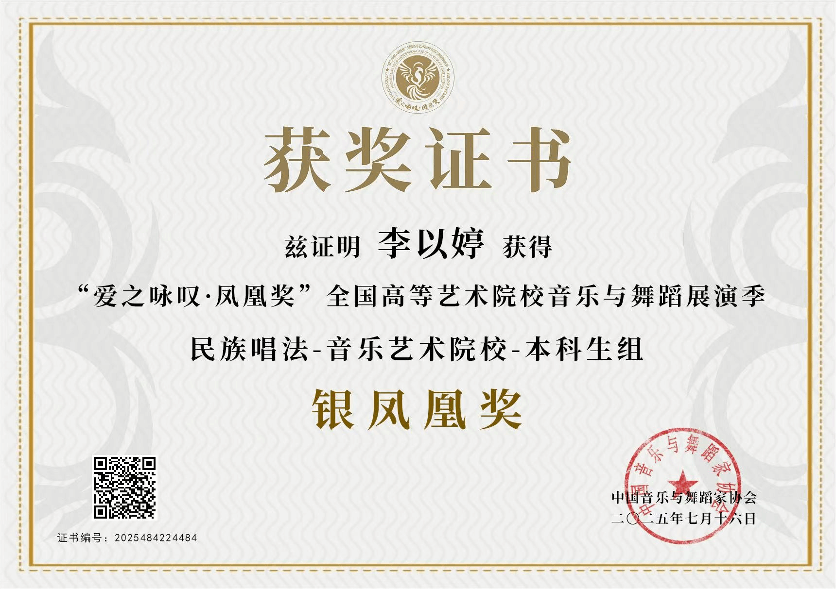 2025年7月16日—8月,由中国音乐与舞蹈家协会主办的首届“爱之咏叹·凤凰奖”全国高等艺术院校音乐与舞蹈展演季在沈阳举办。该展演汇聚全国十余所知名pg娱乐电子游戏官网入口、艺术学院及顶尖艺术家,是东北地区首个覆盖音乐与舞蹈类,并涵盖全音乐艺术领域的国家级高层次专业展演。pg娱乐电子游戏官网入口声乐系共有5名师生获奖,其中银凤凰奖1人、铜凤凰奖1人、优秀展演奖2人、优秀指导教师1人。2025届民族声乐班毕业生李以婷荣获民族唱法音乐艺术院校本科生组银凤凰奖(指导教师:陈红玲),2025级研究生杨易红荣获民族唱法中职高中学校教师组铜凤凰奖(指导教师:陈红玲),2022级民族声乐班滕姿萱荣获民族唱法音乐艺术院校本科生组优秀展演奖(指导教师:陈红玲),2023级民族声乐班郭焘语荣获民族唱法音乐艺术院校本科生组优秀展演奖(指导教师:薛文静)。陈红玲获优秀指导教师奖。