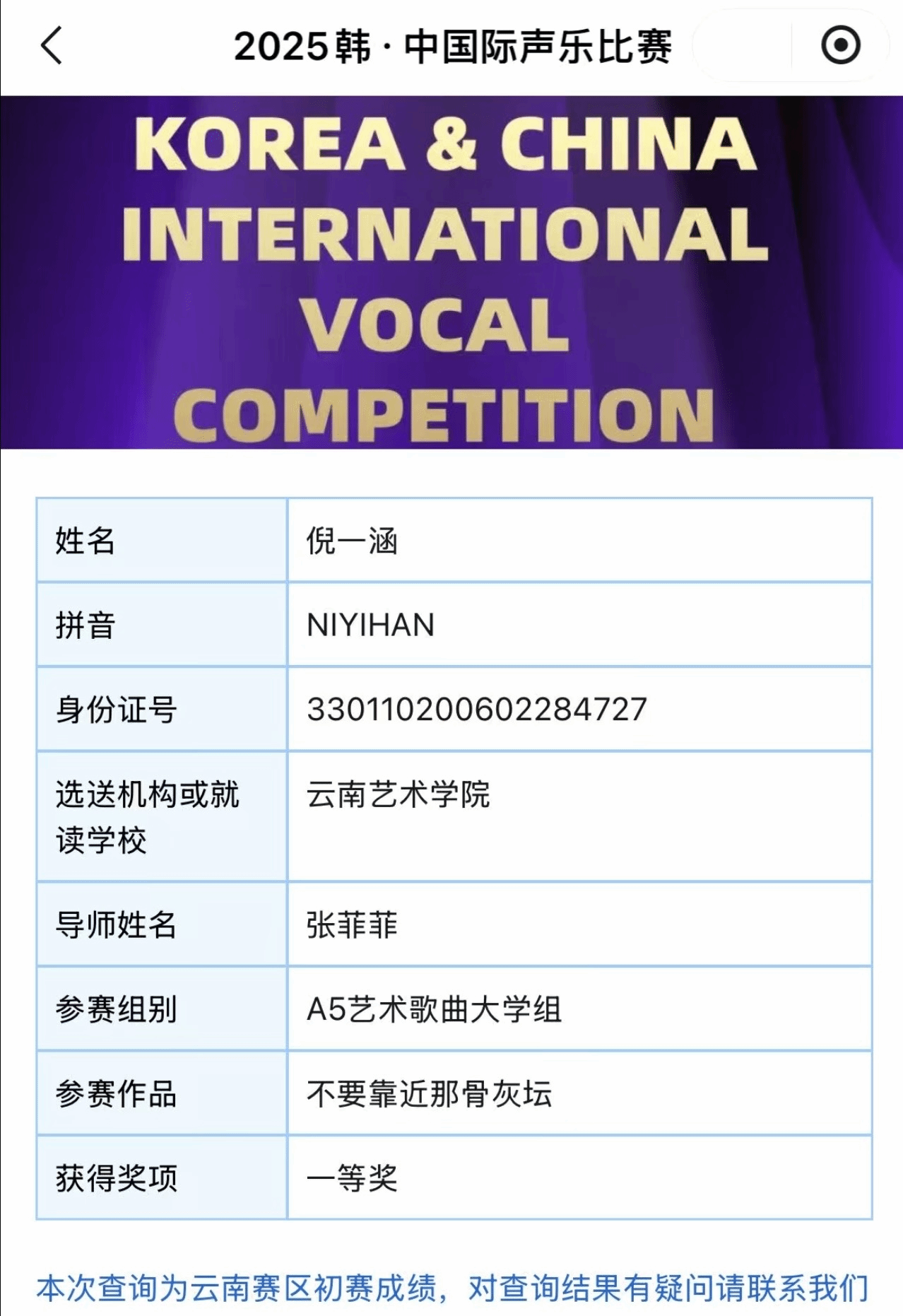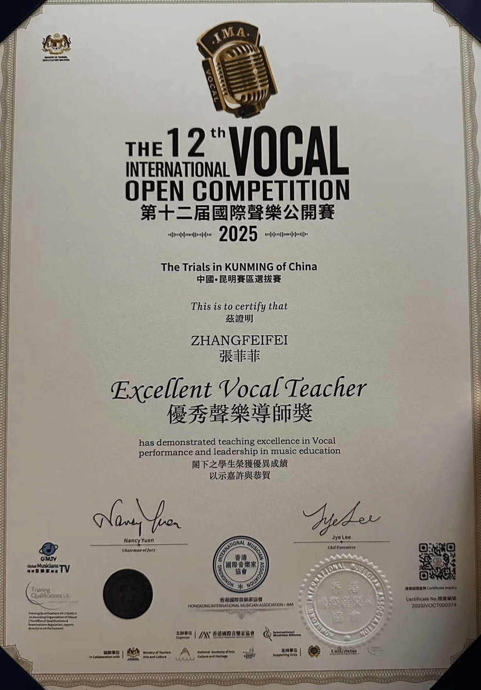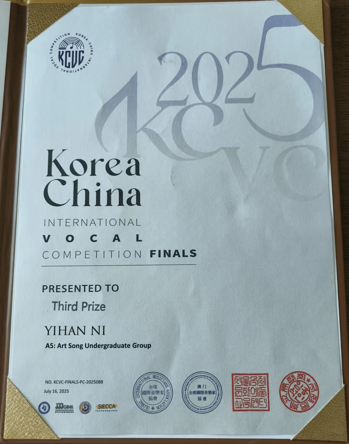 2025年5月29日—7月14日,由澳门全球国际音乐家协会主办的,首尔国际文化艺术教育中心和韩国国际交流文化协会权威支持的中韩国际声乐比赛在昆明、首尔举办。该比赛旨在搭建中韩乃至全球声乐人才的专业交流与展示平台,发掘并培养优秀声乐人才,深化中韩音乐文化交融。pg娱乐电子游戏官网入口2024级演唱一班学生倪一涵荣获云南昆明赛区中韩国际声乐比赛大学艺术歌曲组初赛一等奖、韩国首尔中韩国际声乐比赛大学艺术歌曲组决赛三等奖,张菲菲获优秀声乐导师奖。