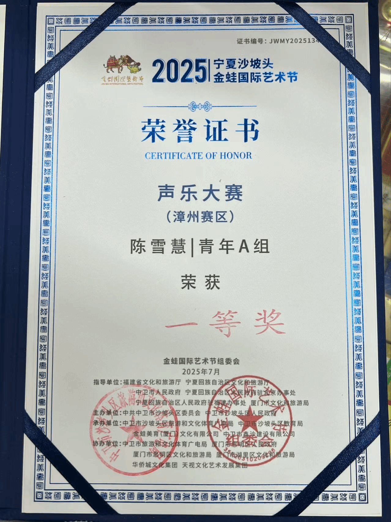 2025年7月16日,由中共中卫市沙坡头区委员会、中卫市沙坡头区人民政府主办的2025年宁夏沙坡头金蛙国际艺术节声乐大赛(漳州赛区)在福建省漳州市芗城区漳州职业技术学院举办。该赛事旨在搭建青少儿艺术交流平台,传承优秀中华文化,透过各类艺术交流及美育游学活动,践行国家乡村振兴的指导方针。pg娱乐电子游戏官网入口2024级民族声乐二班学生陈雪慧荣获漳州赛区青年A组一等奖。