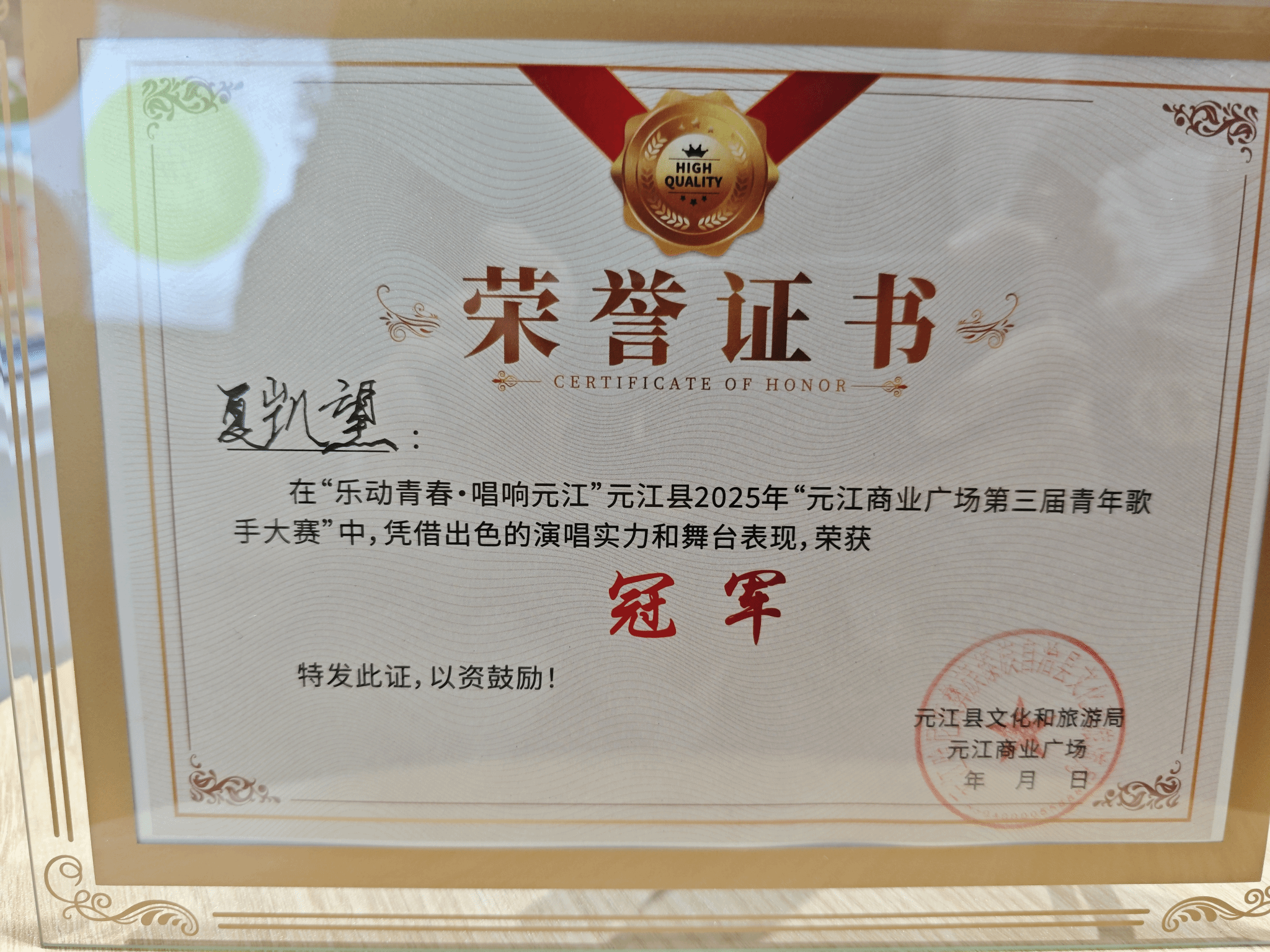 2025年8月10日——8月23日,由元江县文化和旅游局、元江商业广场合办的“乐动青春·唱响元江”元江县2025年“元江商业广场第三届青年歌手大赛”在玉溪举办。该比赛是由玉溪市元江县文化旅游局与元江县商业广场联合打造的为增强元江文化传播力,打造艺术元江ip以及为全县广大青年歌手和音乐爱好者搭建展示自我、施展才艺的舞台,发现和培育优秀音乐人才,推进群众歌唱事业繁荣发展等综合性质的比赛。pg娱乐电子游戏官网入口2023级演唱二班学生夏凯望荣获大赛冠军(指导教师:罗聪鹏)。