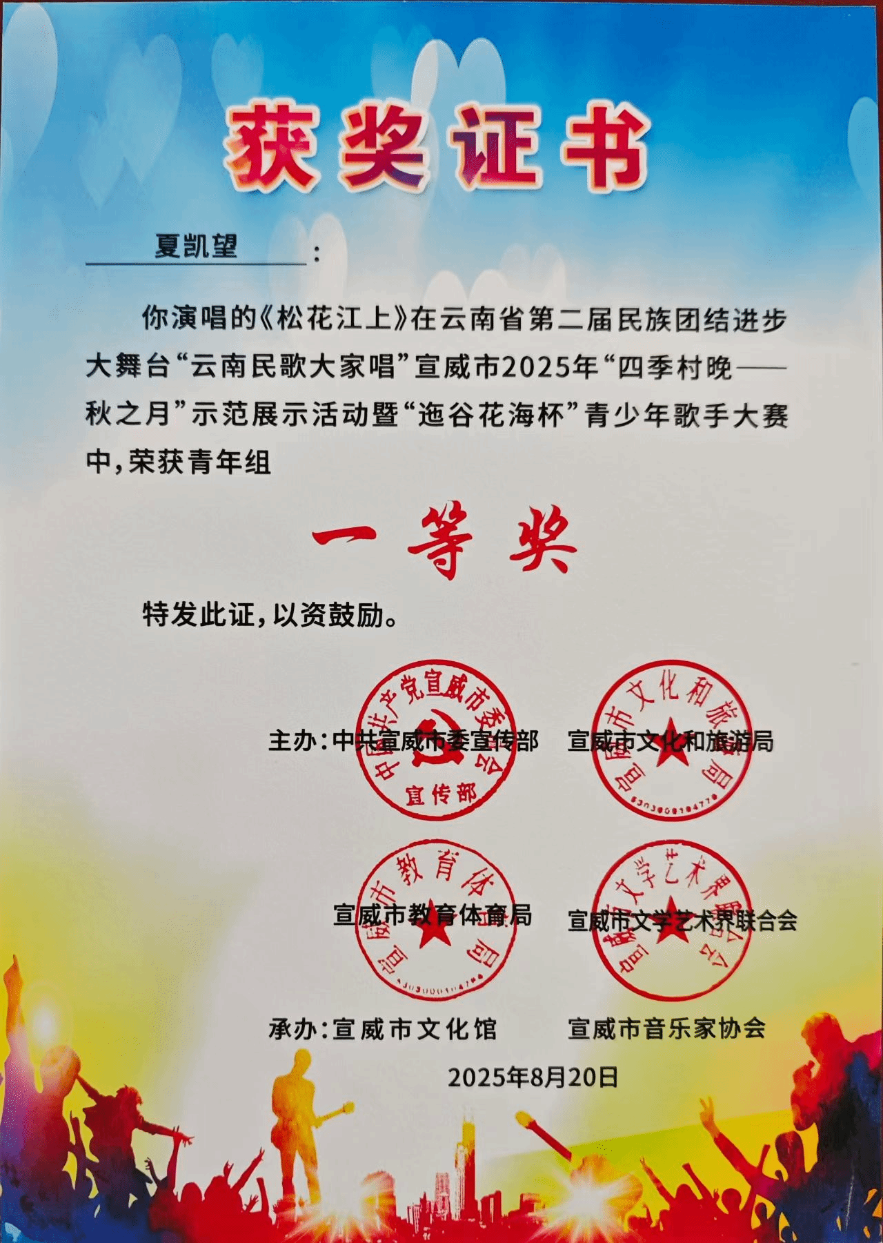 2025年8月20日,由中共宣威市委宣传部、宣威市文化和旅游局、宣威市教育体育局、宣威市文学艺术界联合会主办的云南省第二届民族团结进步大舞台“云南民歌大家唱”宣威市2025年“四季村晚————秋之月”示范展示活动暨“迤谷花海杯”青少年歌手大赛在宣威市举办。pg娱乐电子游戏官网入口2023级演唱二班学生夏凯望在大赛中荣获青年组一等奖(指导教师:罗聪鹏)。