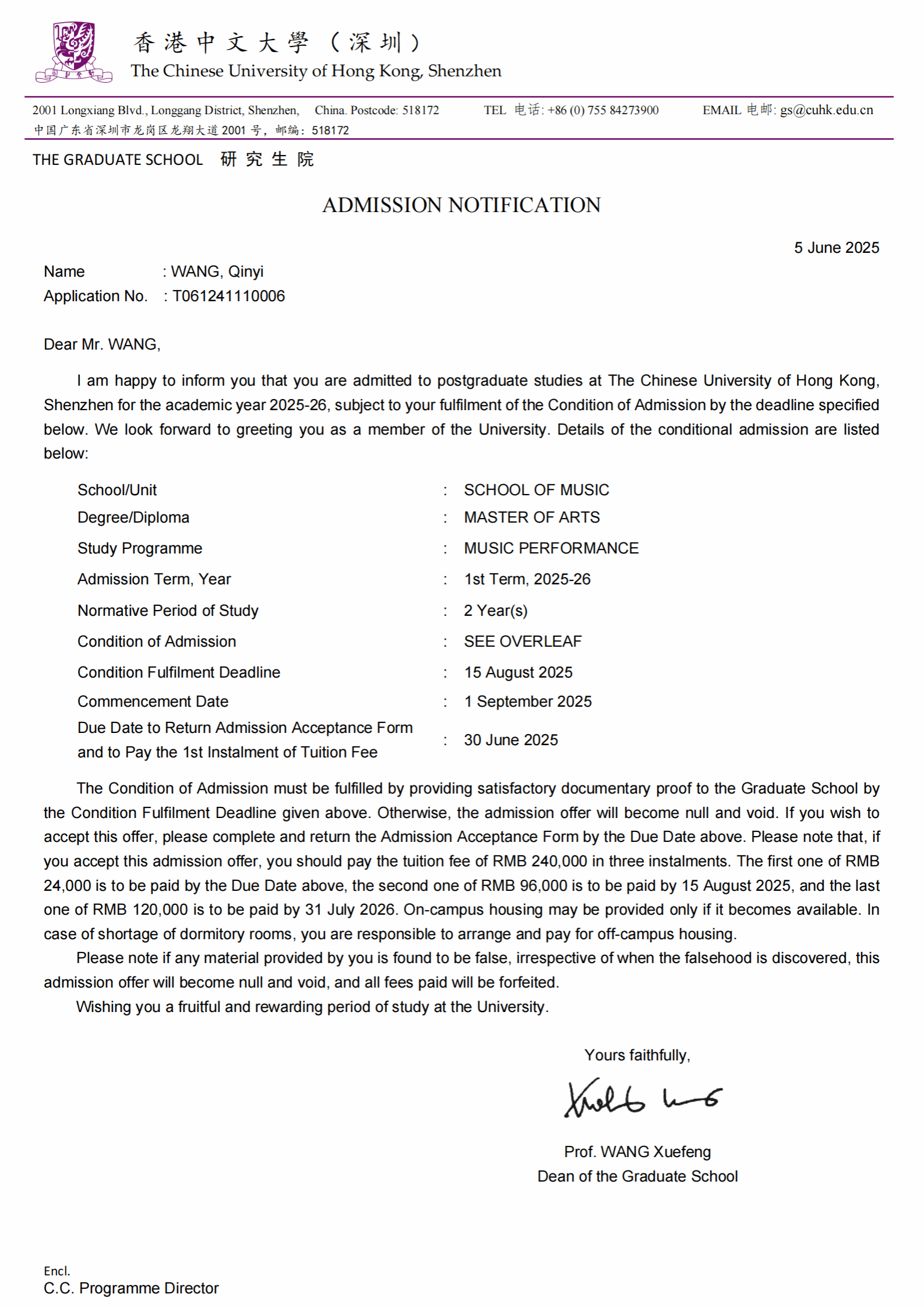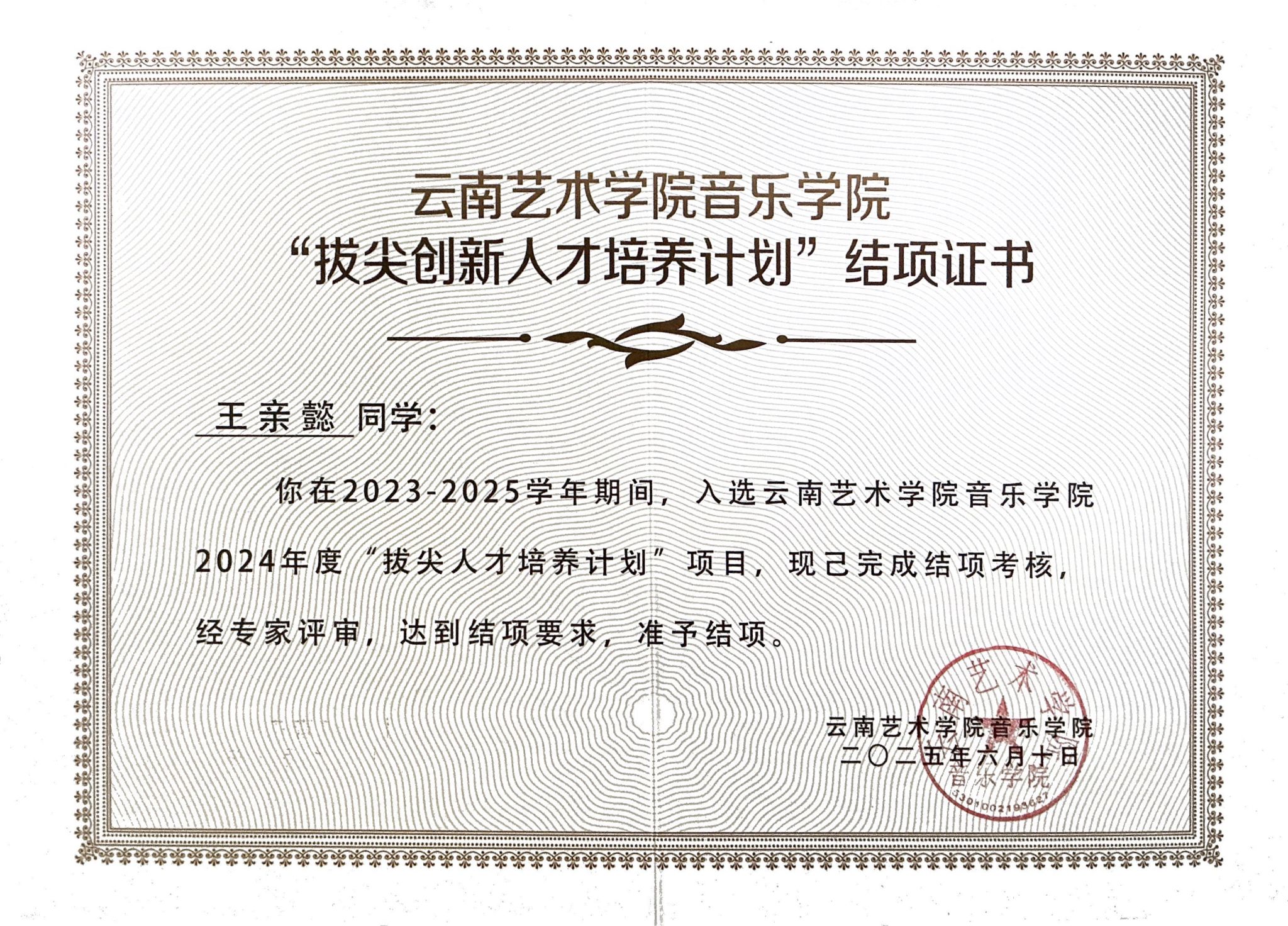 2025年6月,pg娱乐电子游戏官网入口2021级本科生王亲懿获得了香港中文大学(深圳)pg娱乐电子游戏官网入口音乐表演(单簧管)专业的硕士研究生录取通知书。